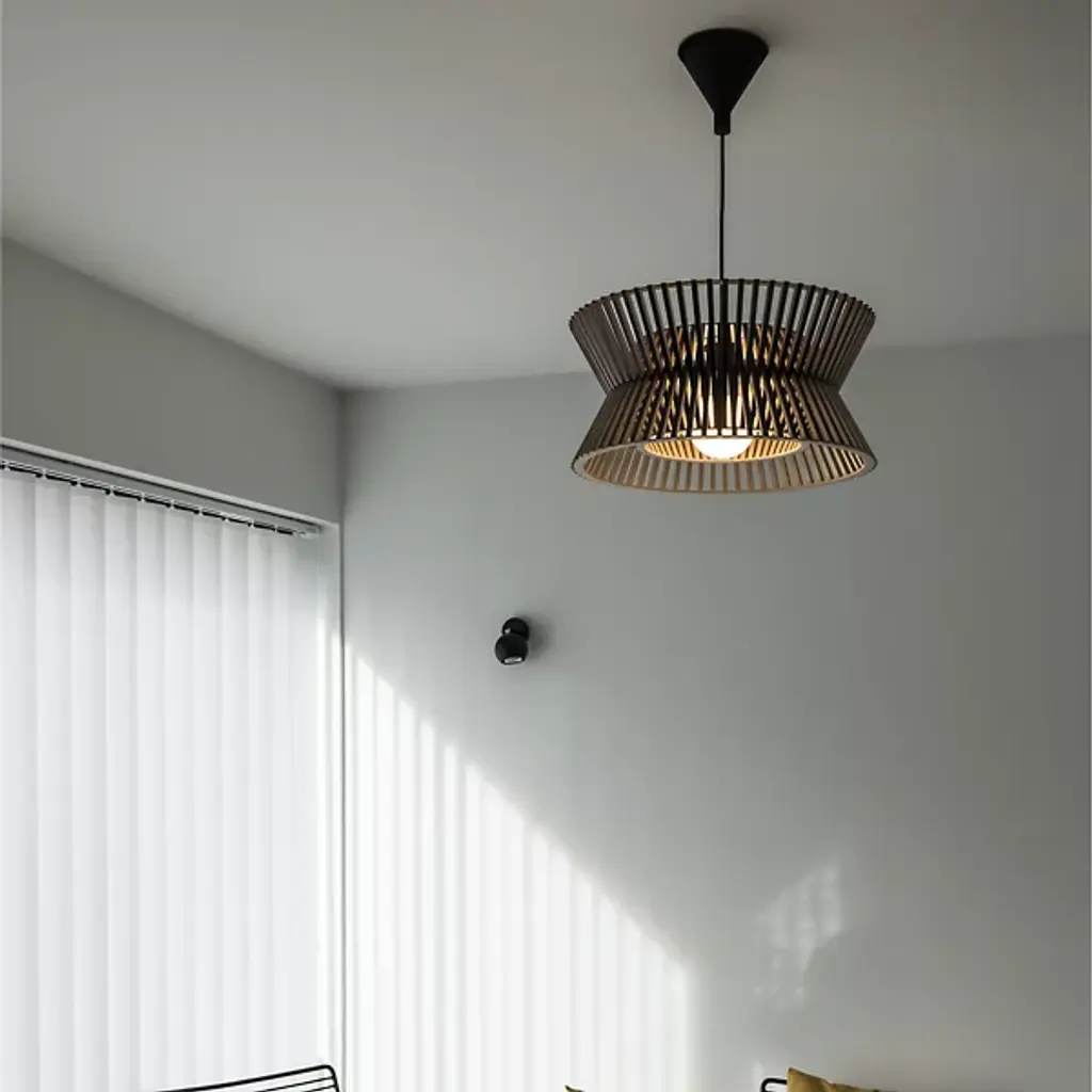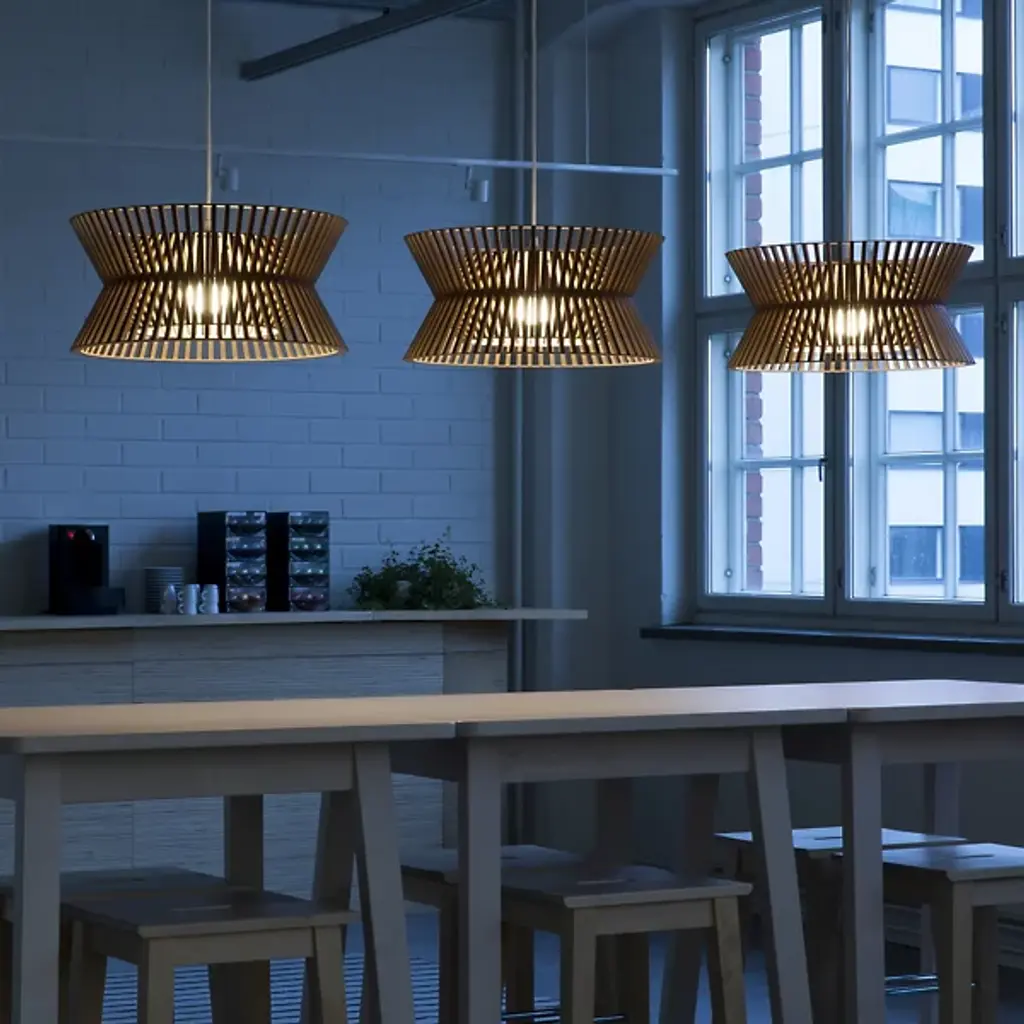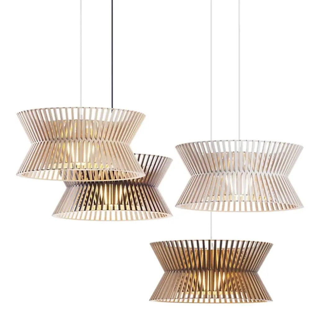 Elegant, open, intricate. Lose yourself in the hypnotizing play of light and shadow created by the Kontro 6000 Pendant from Secto Design. The spirit of designer Seppo Koho’s sketches and handcrafted wooden prototypes stay intact with this beautiful finished product. Koho’s Finnish roots show in the design’s clean Scandinavian aesthetic and birch wood construction. Trim birch wood slats move in an elegant interlacing design composed by Finnish craftsmen. The spaces in between each slat create an intricate layered design that draws your eye from across the room. A flip of the switch enhances the complex form with a dramatic silhouette. Light filtering out creates a comfortable aura you want to be inside.