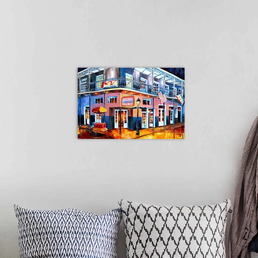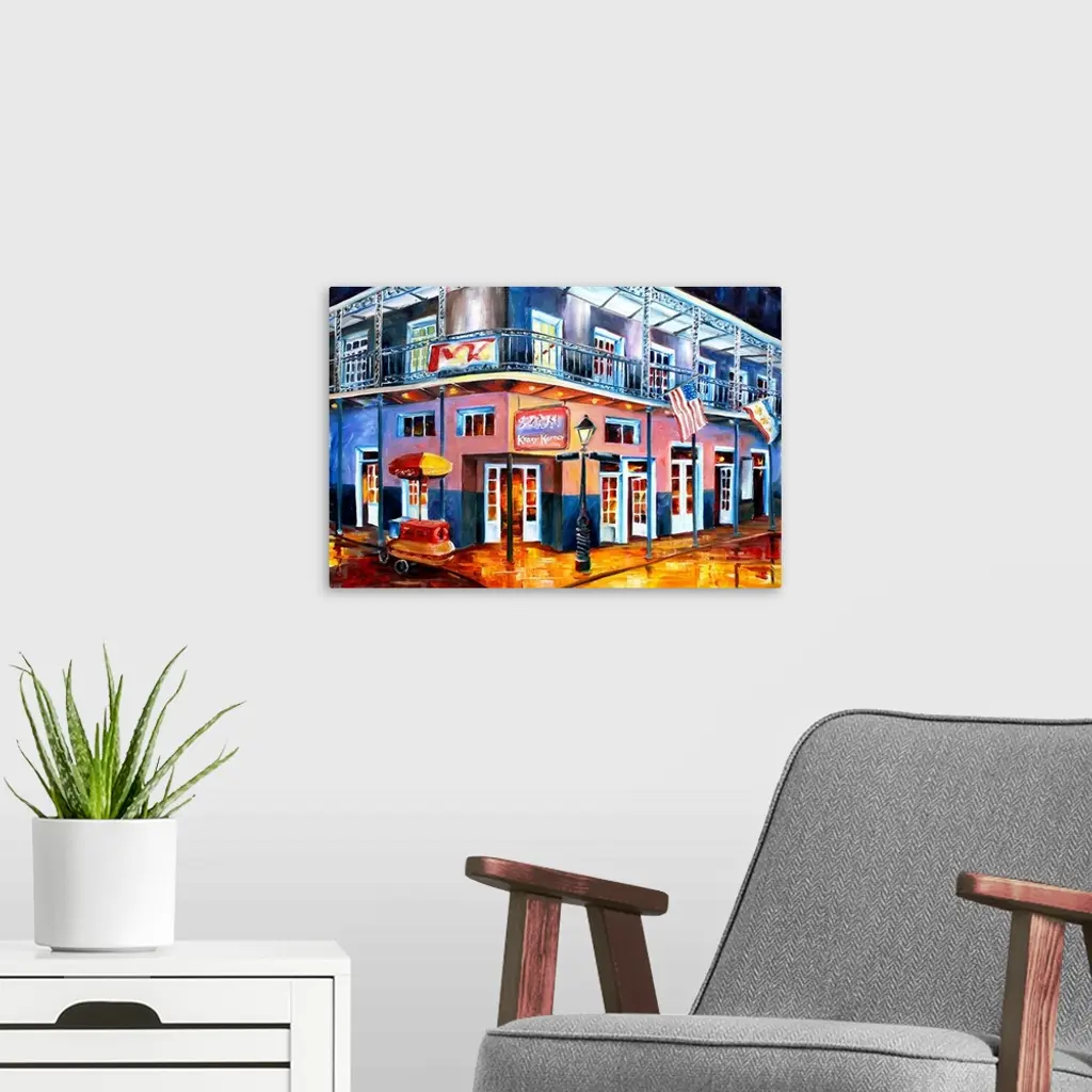Contemporary painting of a corner on Bourbon Street in New Orleans, LA.