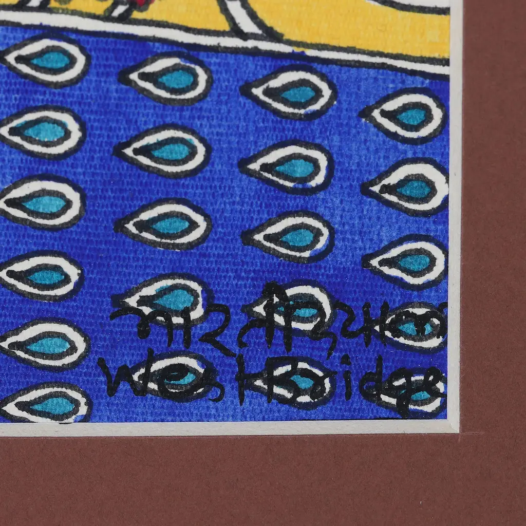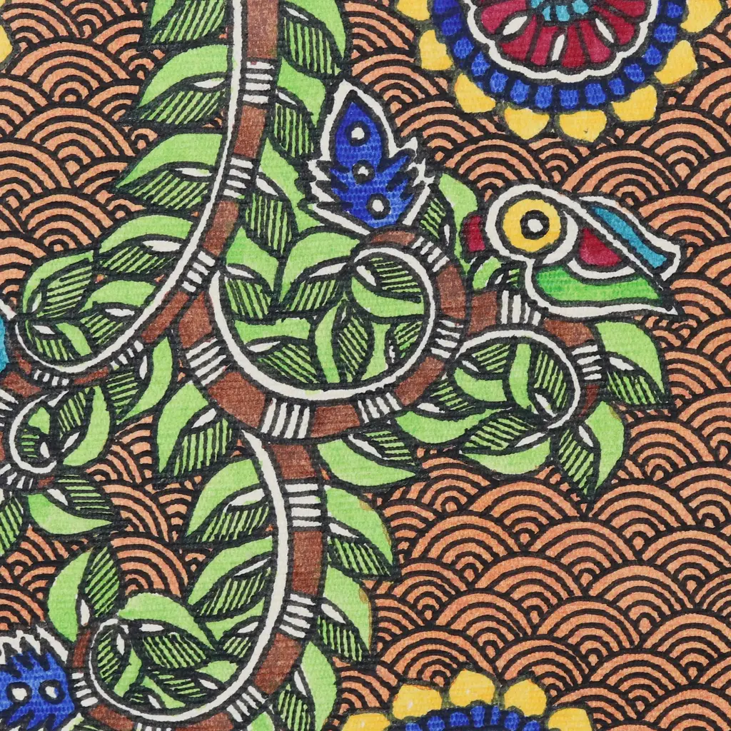 This breathtaking folk painting by Indian artist Bharti Dayal celebrates the eternal love between Hindu deities Krishna and his chief consort, Radha. In this scene they share a private moment as she asks him to play his magical flute, oblivious to the world around them. Acrylic paints and vegetable dyes in bright hues of red, green, blue, brown, grey, black, beige and yellow are applied on handmade paper to craft the exquisite painting in the traditional Madhubani style.