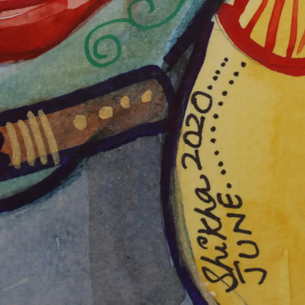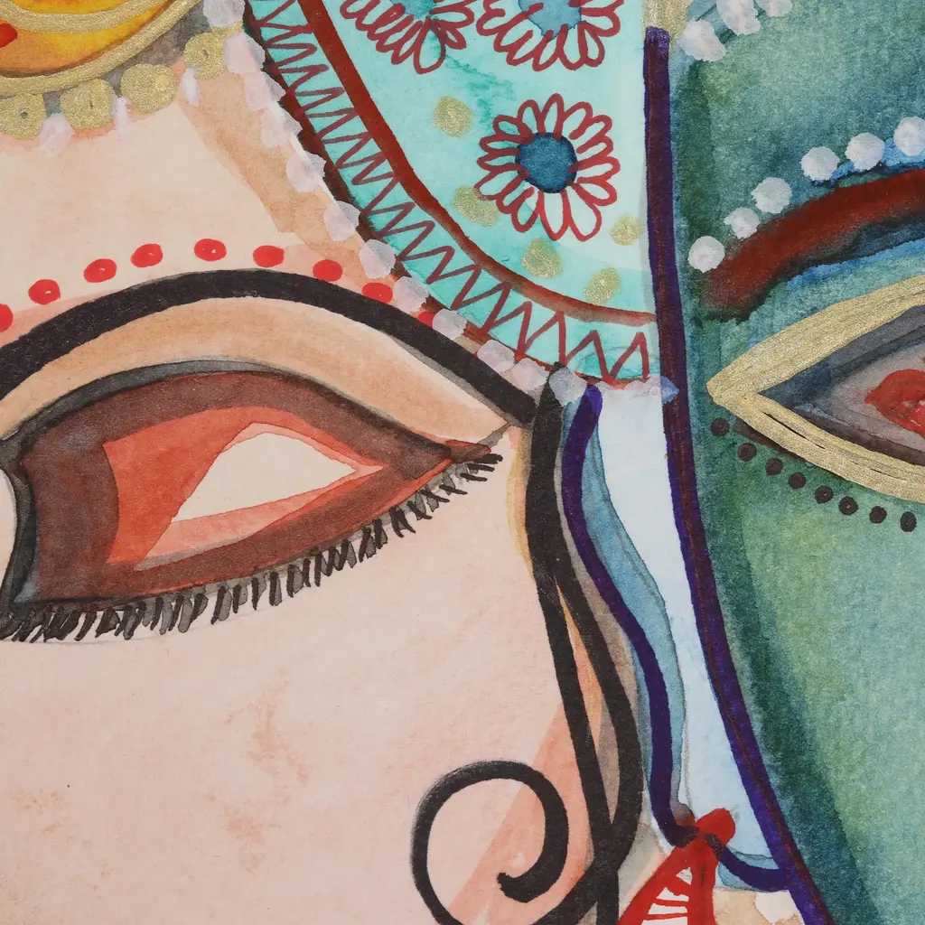 Hindu deities Krishna and Radha become one with nature in this vibrant watercolor painting by India's Shikha Kaistha. Krishna plays his treasured flue as the couple enjoy an afternoon breeze in the garden. Bright blossoms swirl in the background, adding a serene touch to the painting.