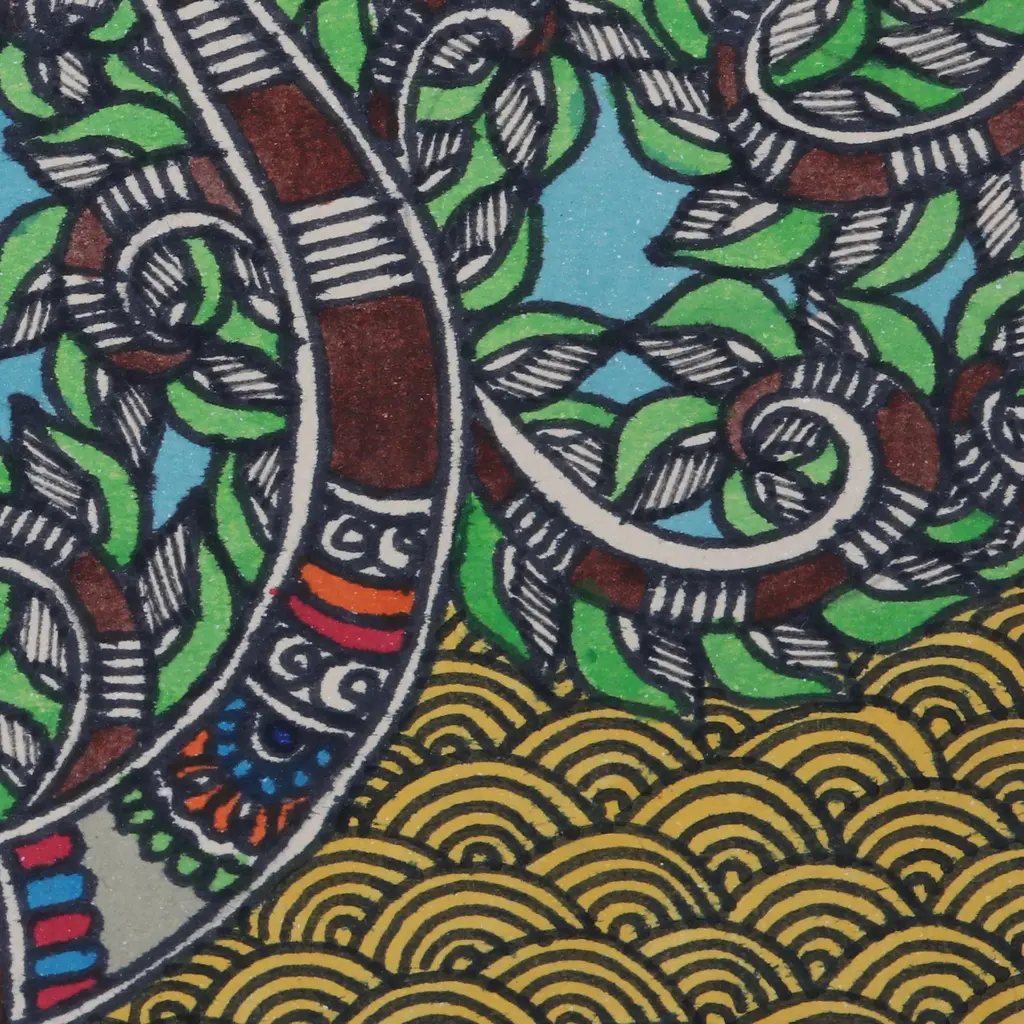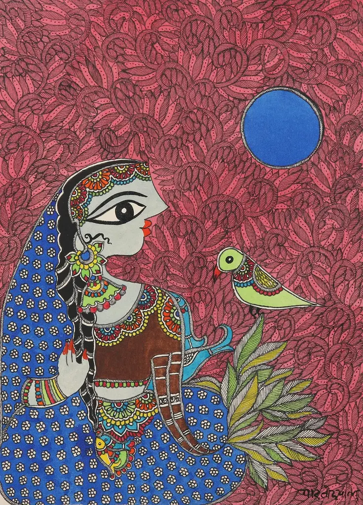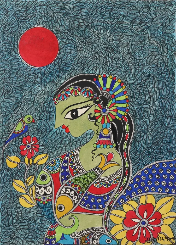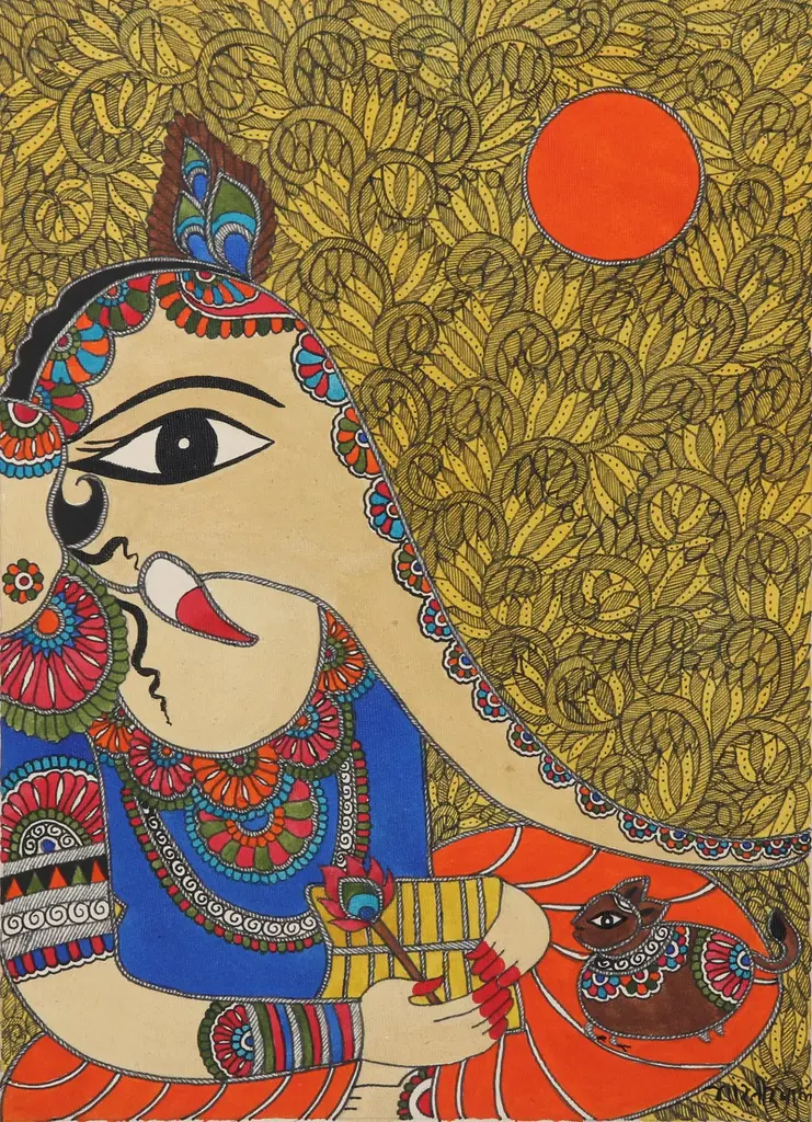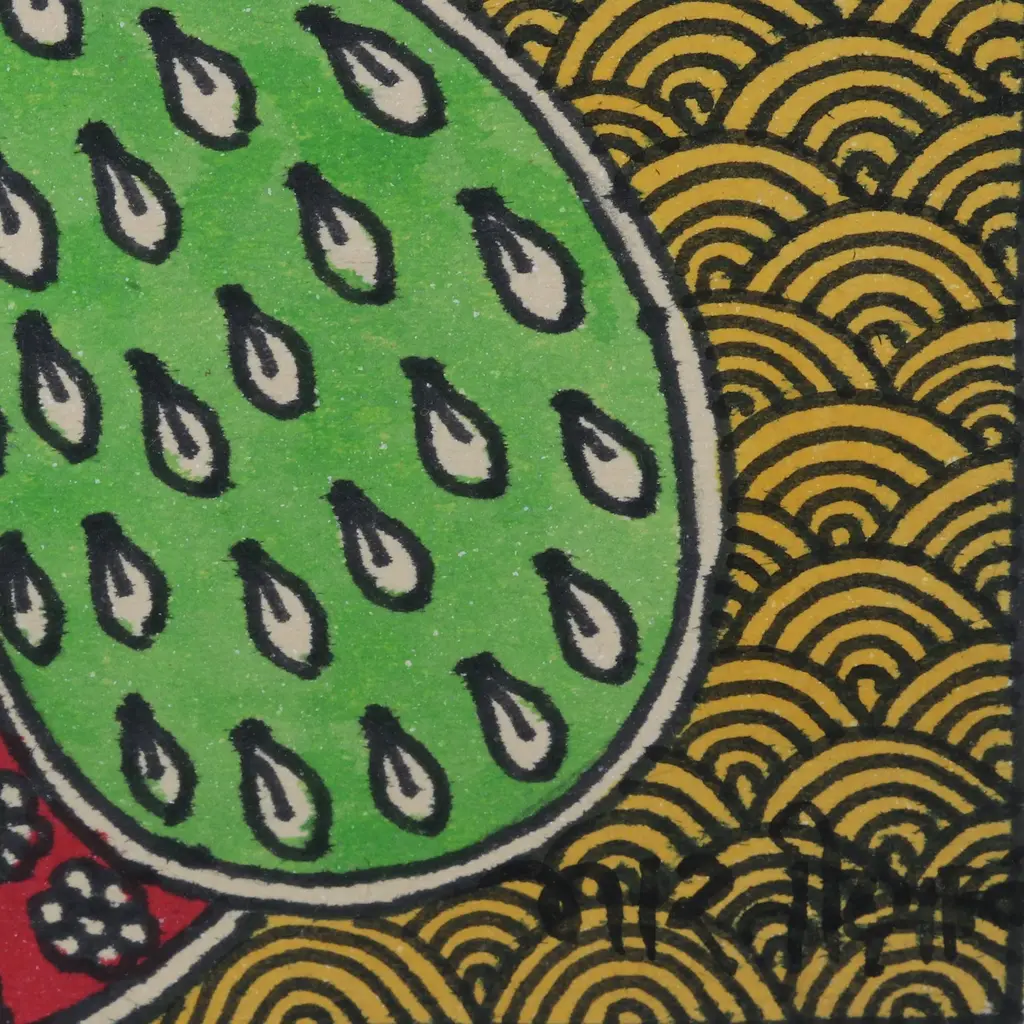 Krishna, the god of compassion and love in Hinduism, is portrayed in all his majesty in this splendid folk painting in Madhubani style by award-winner Indian artist Bharti Dayal. Her spectacular depiction of the mighty Hindu deity is crafted with acrylic paint and vegetable dyes that are carefully applied to handmade paper with brushes, sharpened reeds and pen nibs.