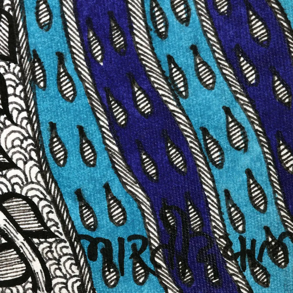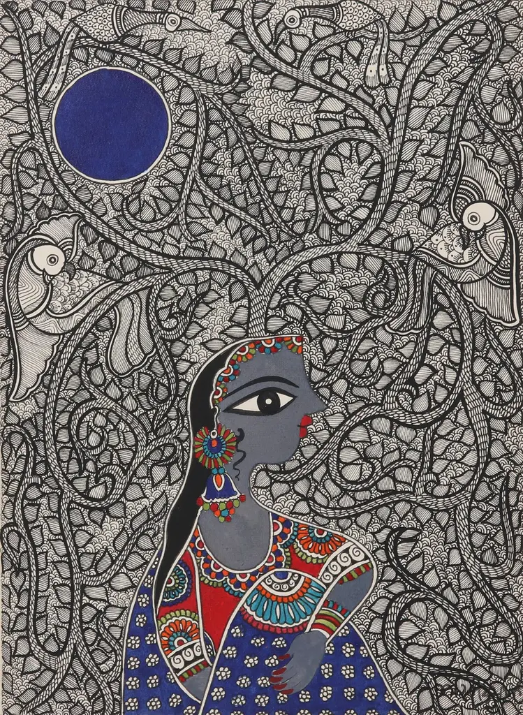 A majestic peacock sits beside Lord Krishna, in royal attire, as the two enjoy the beauty of nature together. Bharti Dayal creates this Indian folk painting with bright acrylic, using brushes, sharpened reeds, and pen nibs to produce the illustrative quality of the figures and patterns.