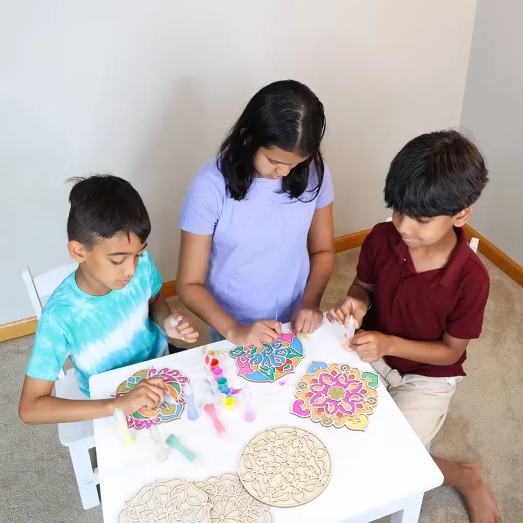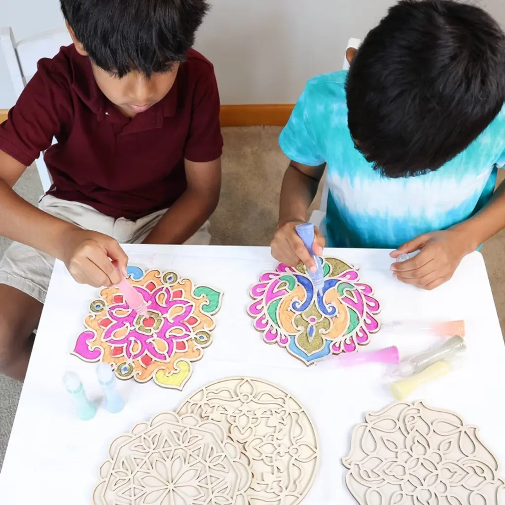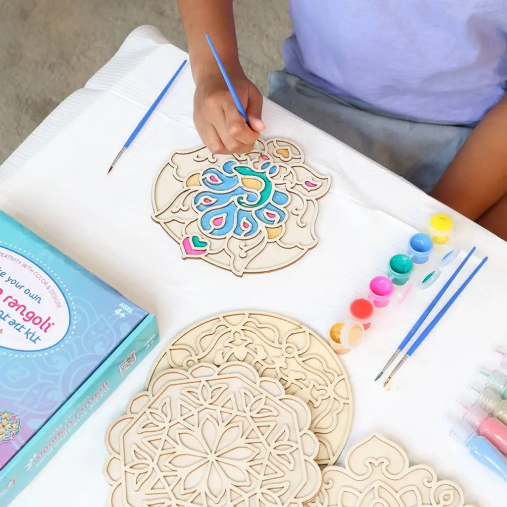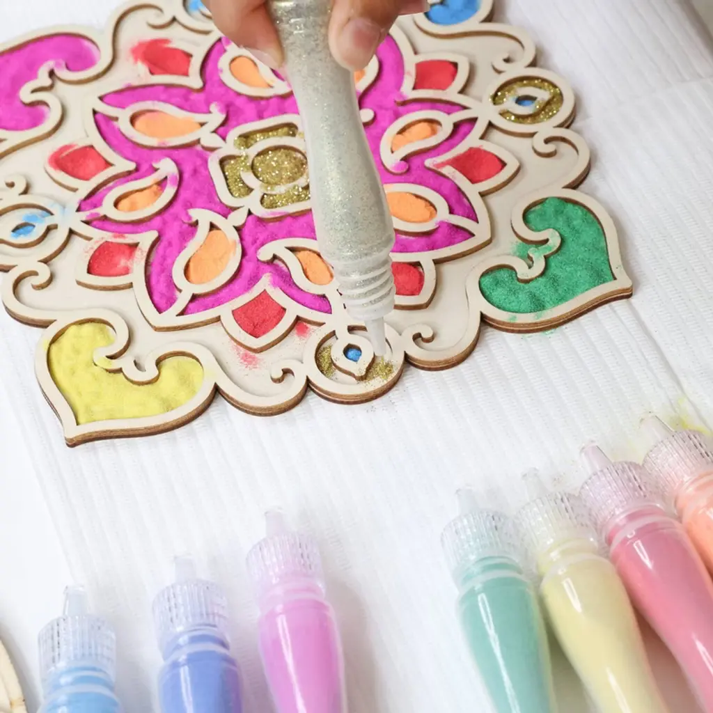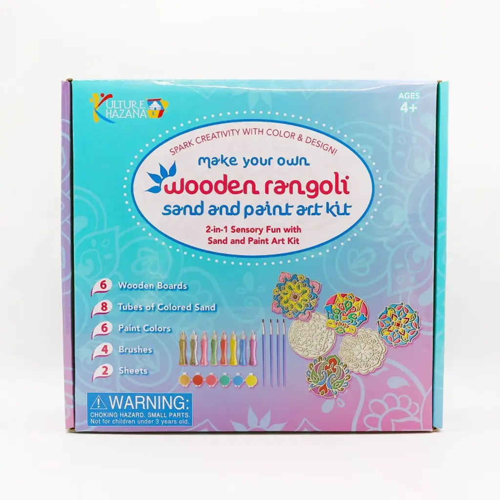 Bring color, culture, and creativity to your home with the Kulture Khazana Wooden Rangoli 2‑in‑1 Sand & Paint Kit. Inspired by the traditional Indian art of Rangoli Mandala, this one‑of‑a‑kind craft set lets kids and families create vibrant designs in two exciting ways: by pouring colorful sand into the engraved wooden patterns or painting them with bright, included paints. The sand can be poured out and reused for endless designs, making it an eco‑friendly, repeat‑play activity. Perfect for sensory play and family bonding, this kit is both culturally rich and fun for all backgrounds. Mess‑free play is easy with two included drop cloths, so you can enjoy hours of creativity without the cleanup. A meaningful way to connect with heritage or simply explore a new art form, this Rangoli kit is as educational as it is entertaining.