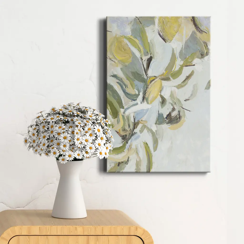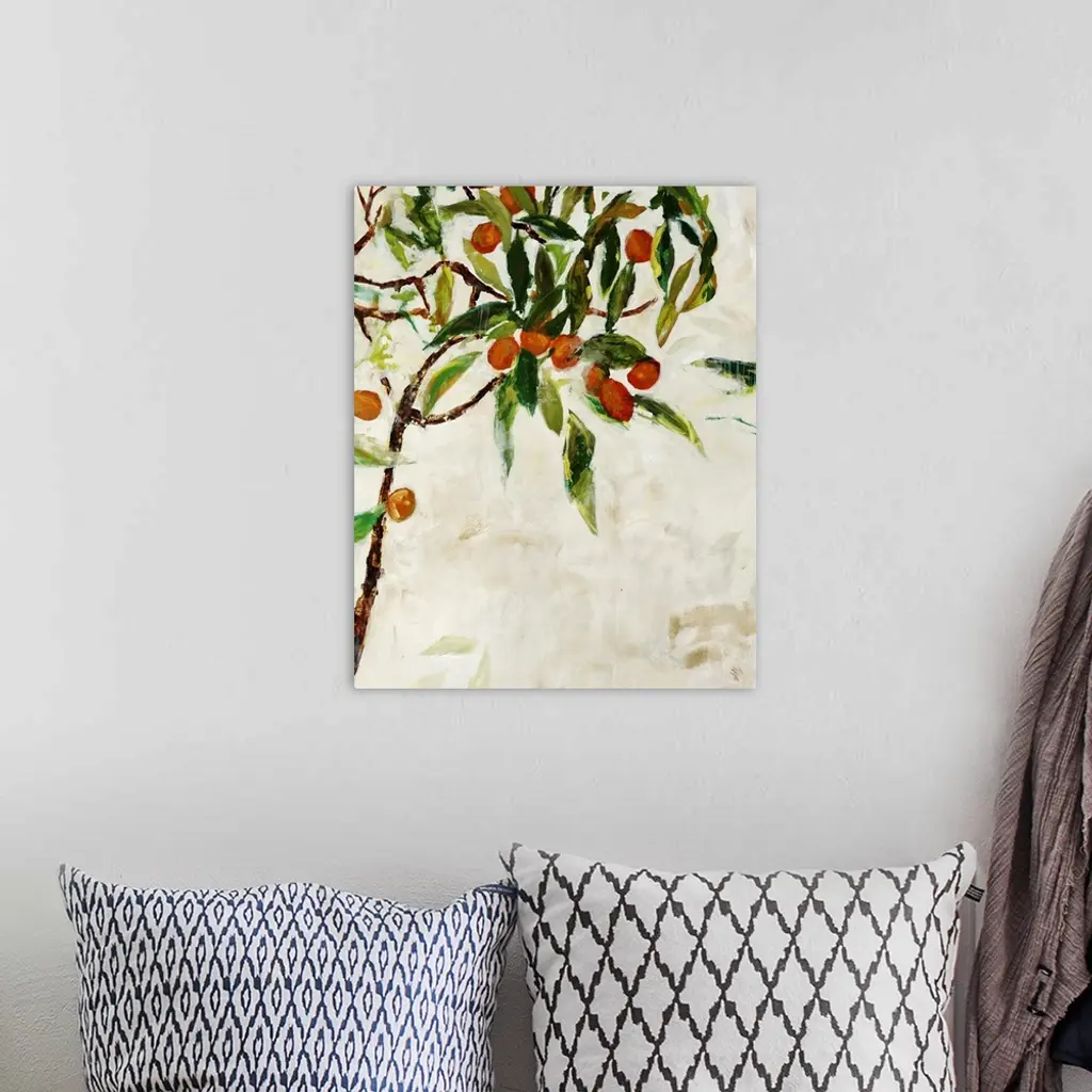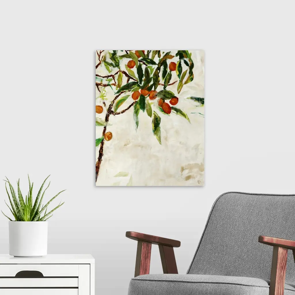 Contemporary painting of a kumquat tree over a neutral background.