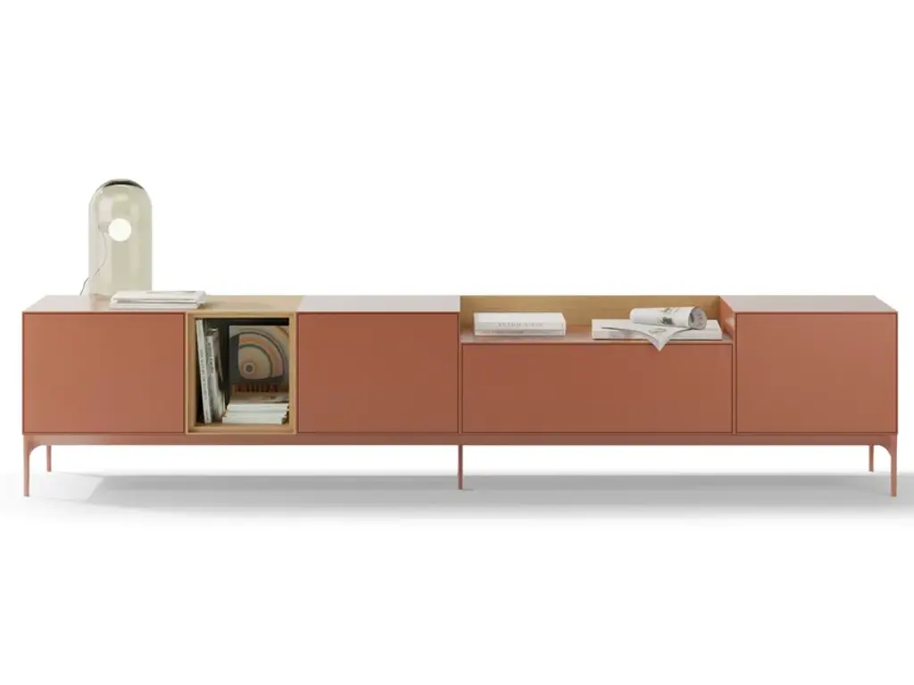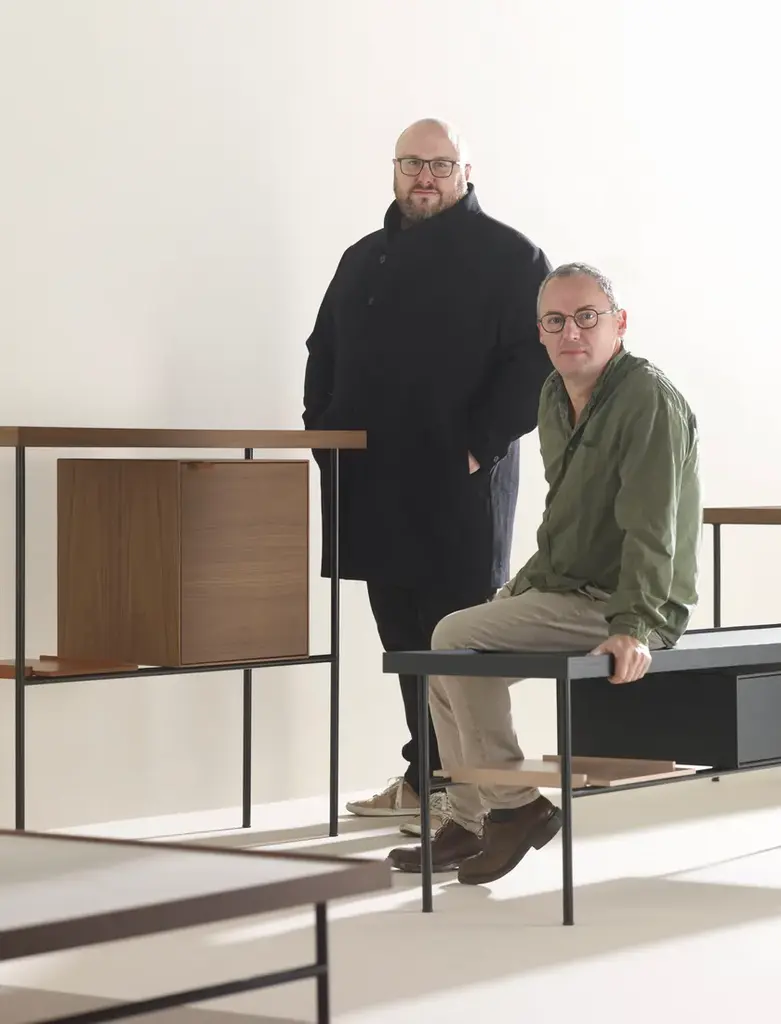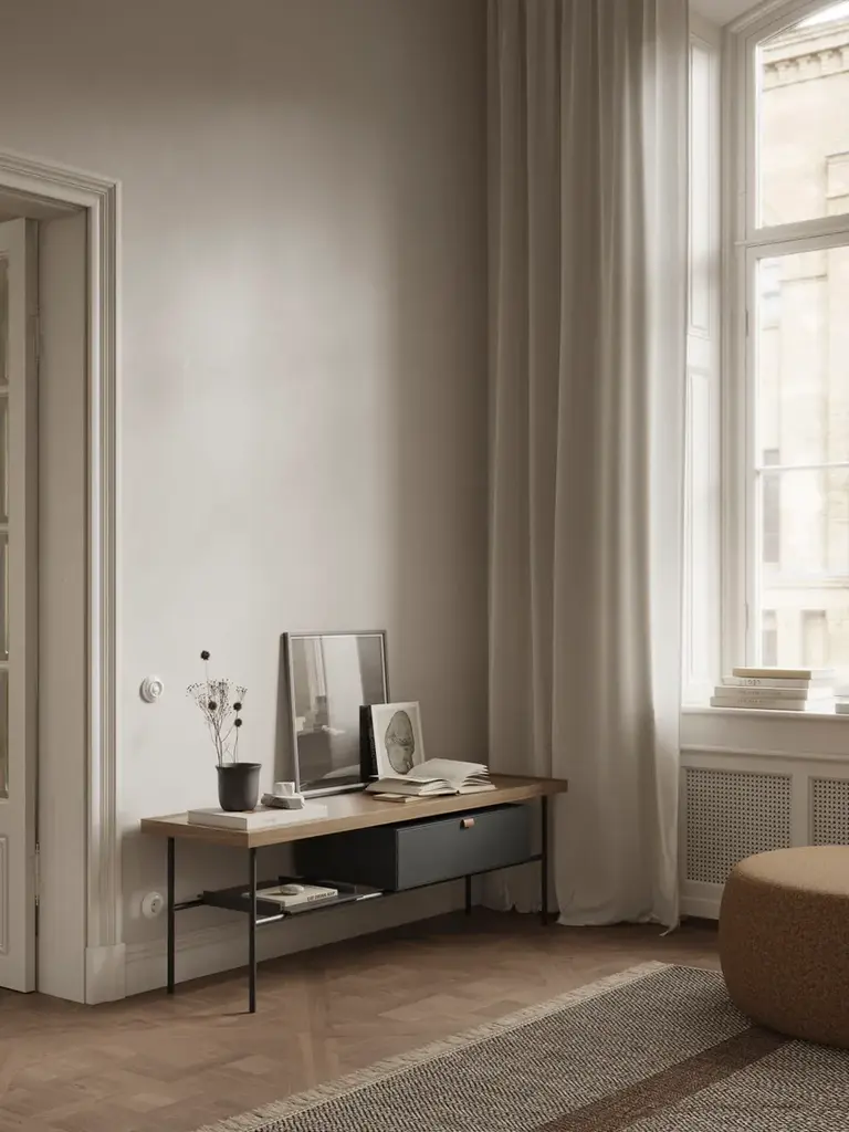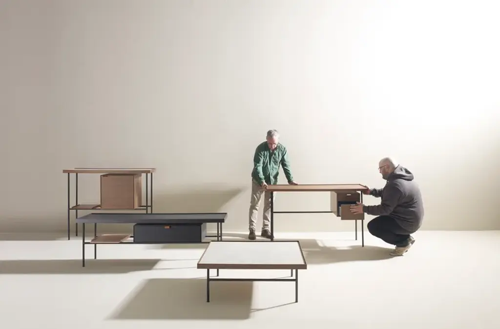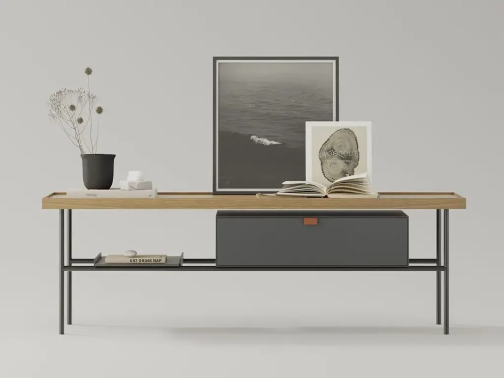 Kutxa is a sideboard with drawer and shelf.Everything stems from a drawing that came up unexpectedly. That sketch already showed the idea of a box suspended within a very simple and architectural structure. The play of contrasts was also present, between the sturdiness of wood and the delicacy of metal. All the pieces in the Kutxa collection have a sculptural touch, but without direct reference to artists or their work. The idea is that this furniture contributes to creating more peaceful, cared-for spaces, rather than simply optimising storage space. We were keen to create a furniture collection with different figures, where each piece has its own personality and fulfils a function within a visual framework.