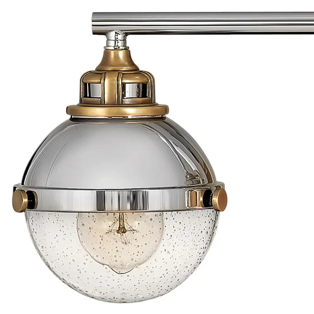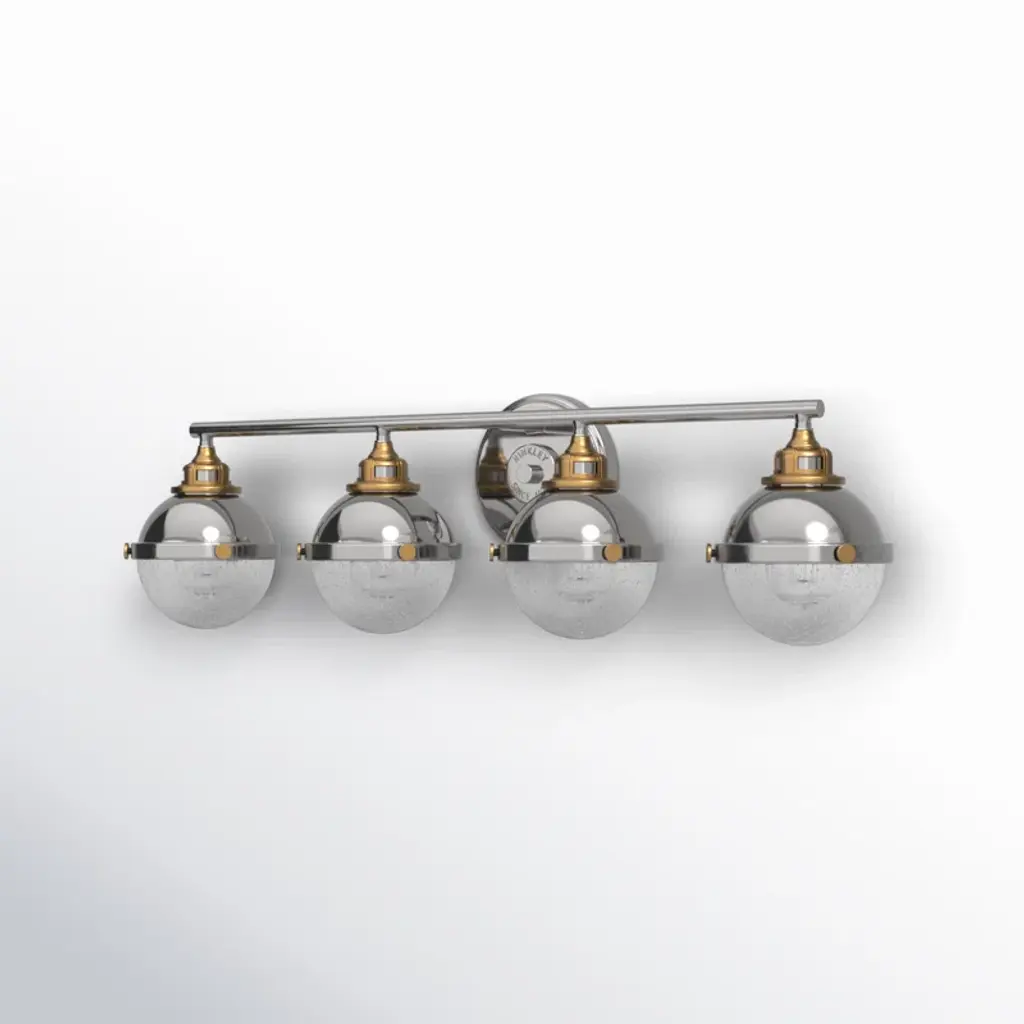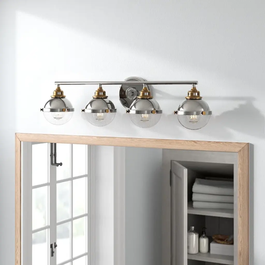 This Four Light Bath Vanity fixture's decorative details are noticed, infusing character in bathrooms, ensuites, and powder rooms. Heritage Brass cast knobs secure Clear Seedy Glass shades in place, while the reflective, chrome-like shine of the Polished Nickel finish complements multiple decors - Chic, Classic, Industrial, Transitional, and Vintage. This set of lights can be mounted up or down, and each globe is illuminated by an 8w Medium LED bulb (not included).