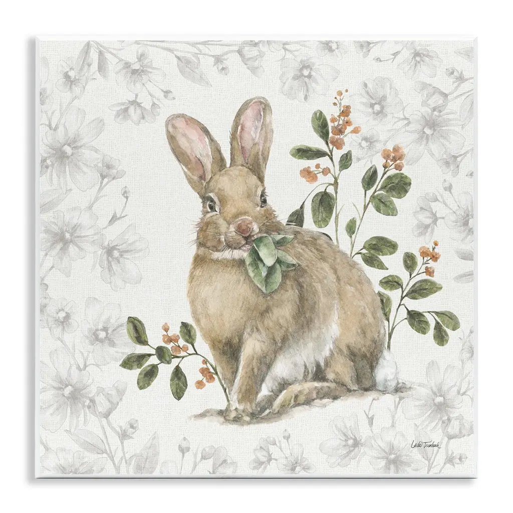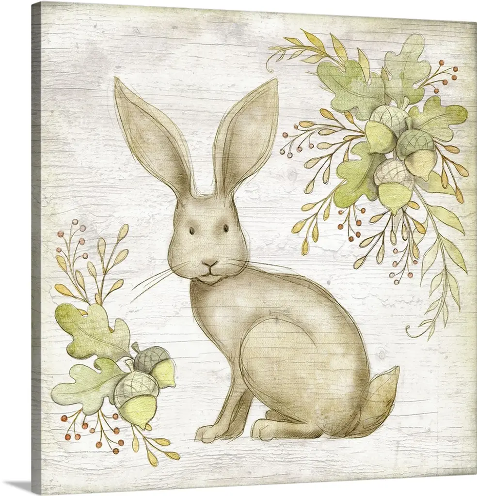 Rabbit Leaves by Kyra Brown is a high quality piece of canvas artwork. The finished size of this piece is 12" X 12", and it has a depth 1.5" with nutmeg painted sides. There is a UV protective coating over the entire image, and it is ready to hang on your wall with no hardware required.