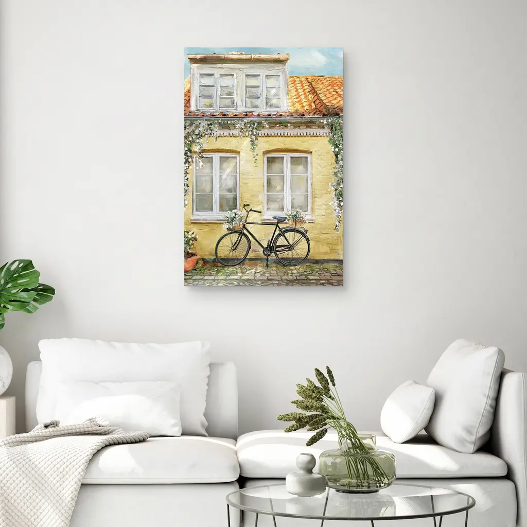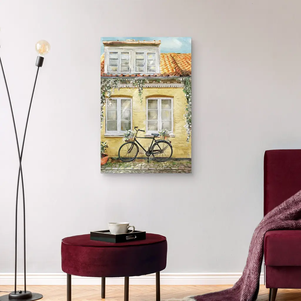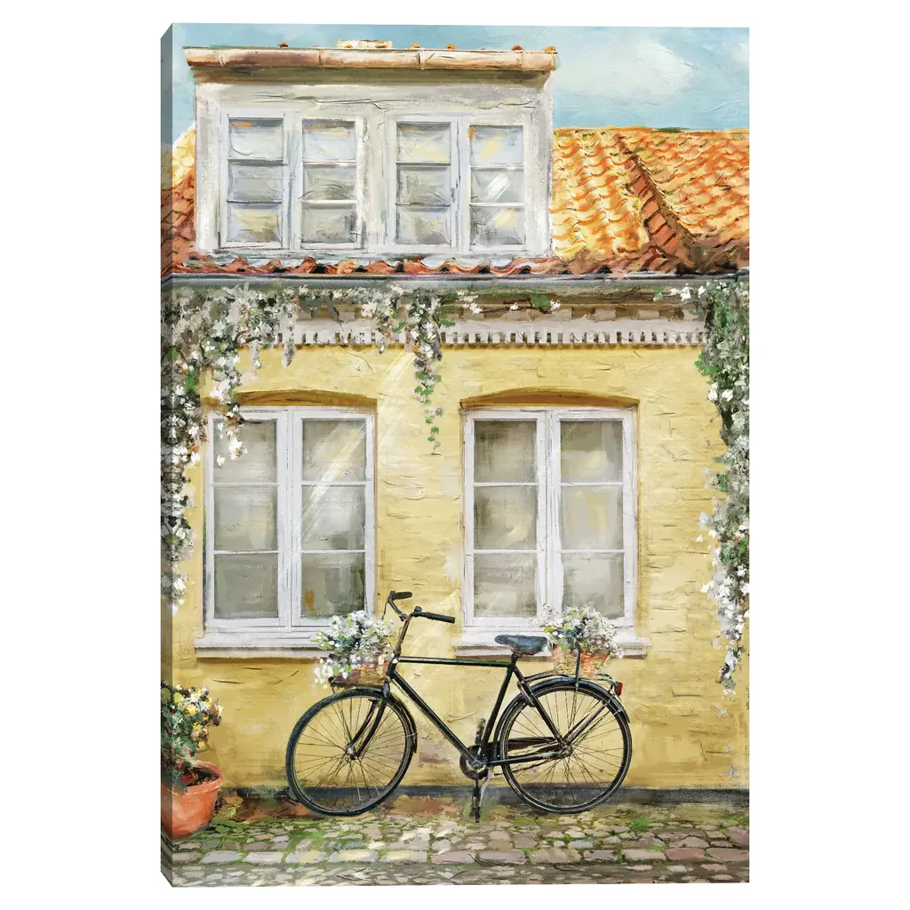 La Bicyclette by Studio Arts Canvas Art Print is produced with printing that covers the entirety of the canvas for a sleek and stylish museum-quality look. Our framed prints are made by expert craftsmen who strive to make each canvas the masterpiece