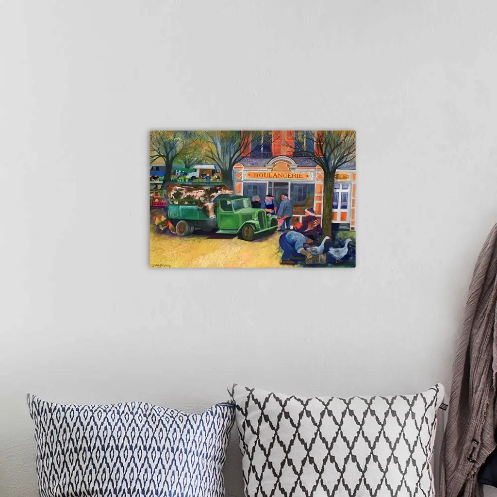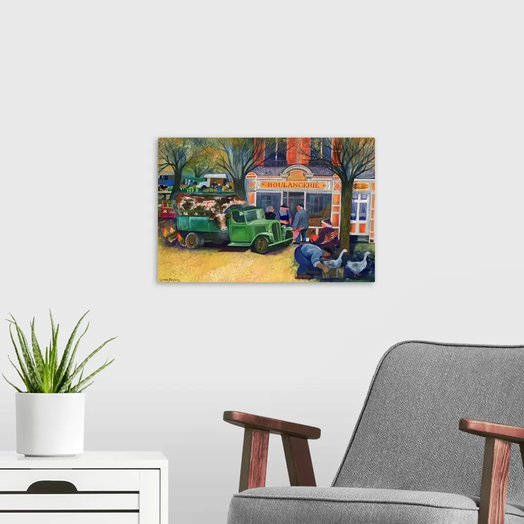 Contemporary painting of a pickup truck unloading in front of a bakery.