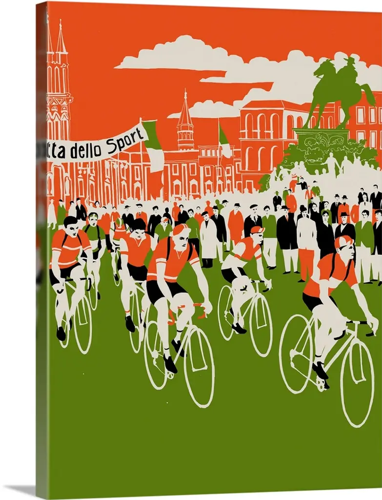Antique advertising poster of cyclists racing by with bystanders in the background.