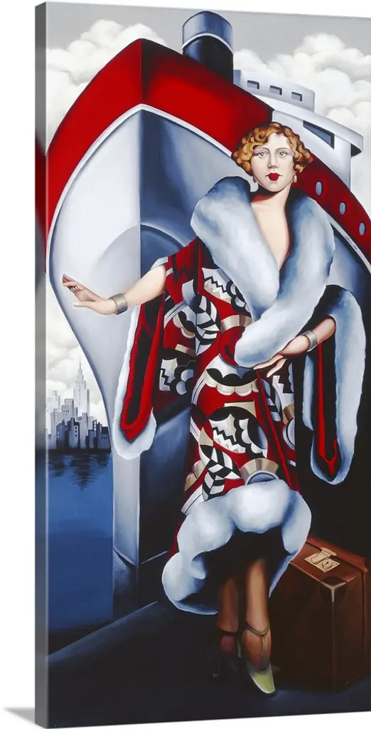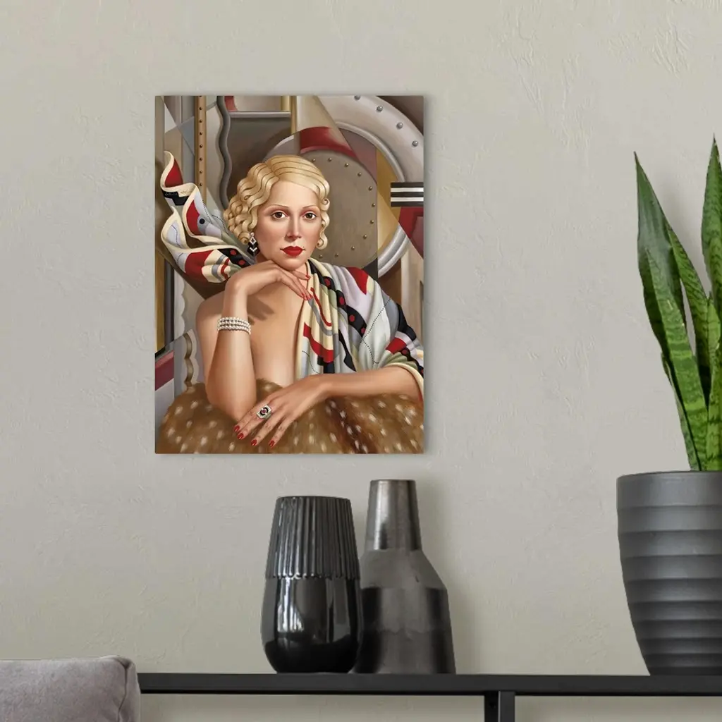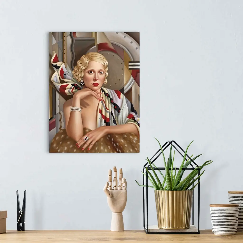 Contemporary art deco style painting of a woman with blonde hair against a geometric abstract background.