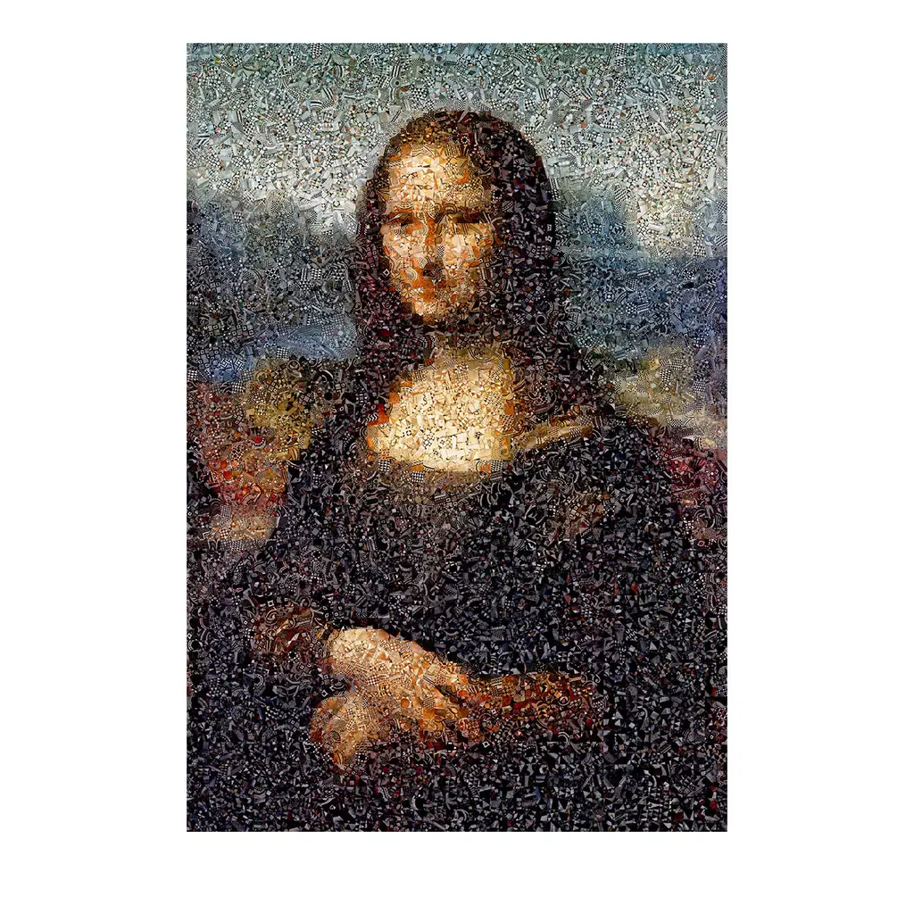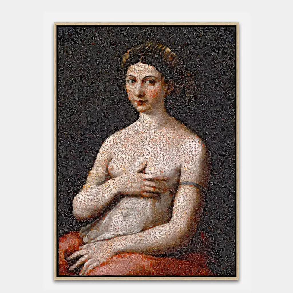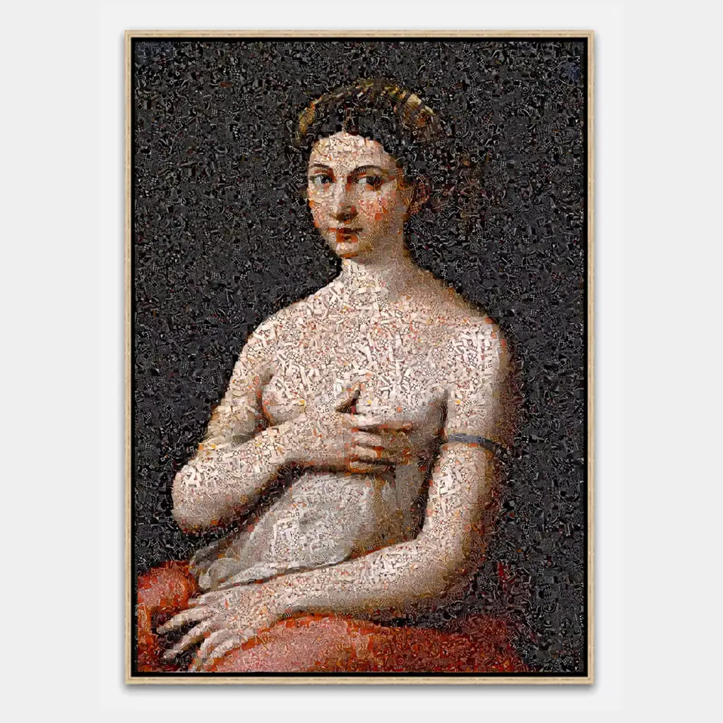 La Fornarina is composed of 5100 photographic tiles of the mosaic floor of St. Mark’s Basilica in Venice that have been used to elaborate this work provided with a double certificate of authenticity and uniqueness countersigned by the artist and blockchain registered. The work can be ordered with a handcrafted wood frame. Revisiting Raffaello Sanzio's 'La Fornarina' 100×70,5 cm, 2020, pigment print on fine art paper, acrylic glass, aluminum. Please ask the Concierge for further information