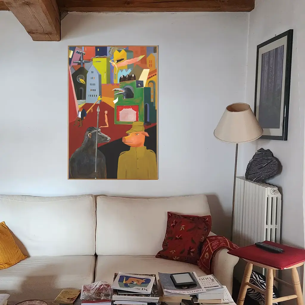 This exquisite painting part of the Tarocchi series offers a surreal version of a trial. A man is in anguish waiting for his verdict since, due to unfocused judges, justice is taking too long to complete its path. Unconventional, rude soldiers safeguard the proceeding, the whole scene painted in vibrant colors for an ironic counterbalance to the moment's emotional heaviness. Frame not included.