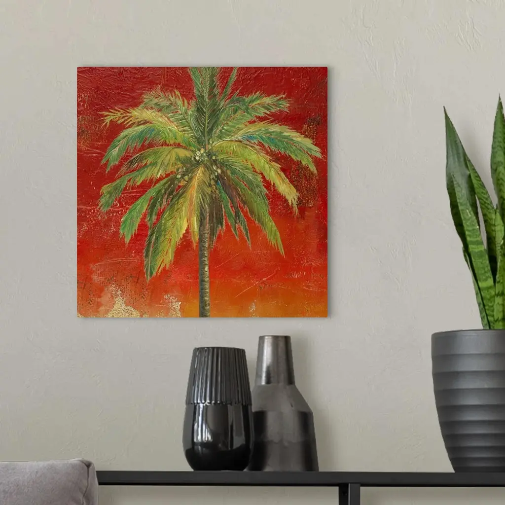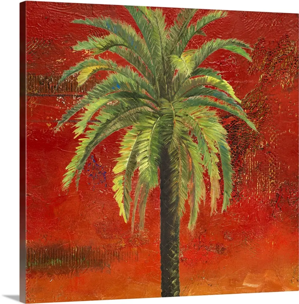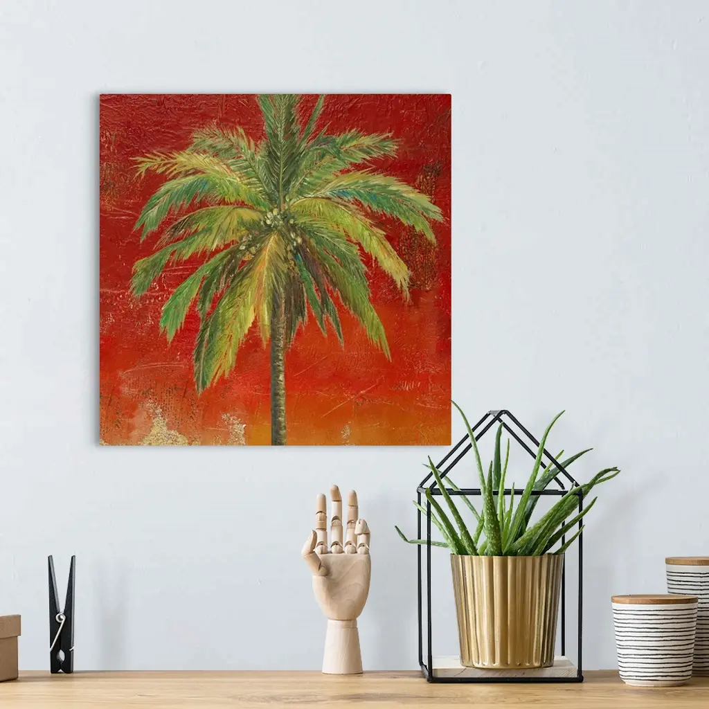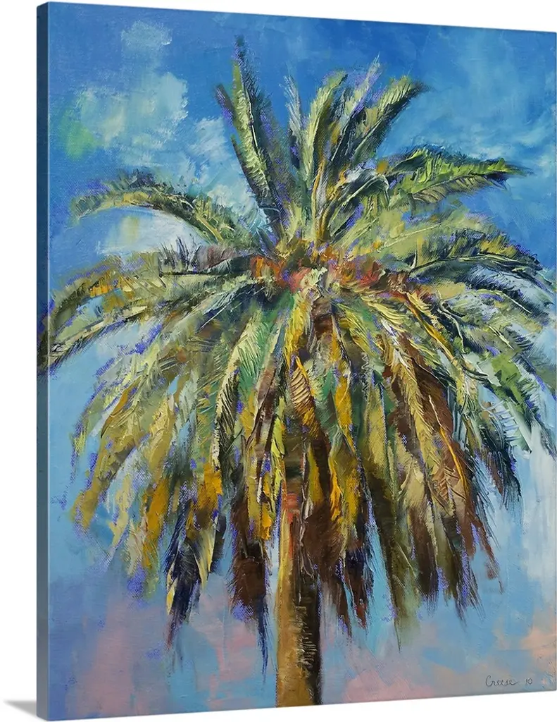 This mixed media art work is a realistic painting of a palm tree against and abstract high textured background.