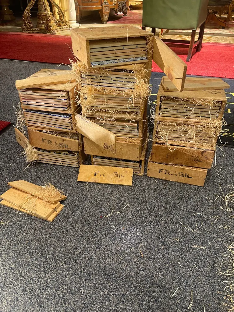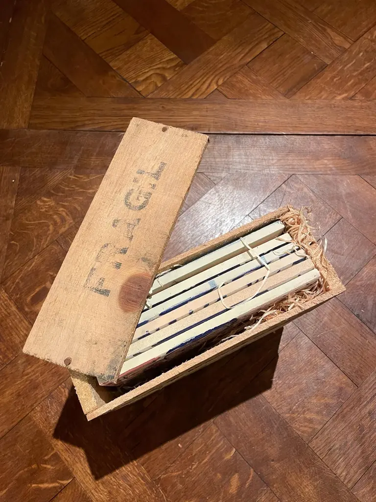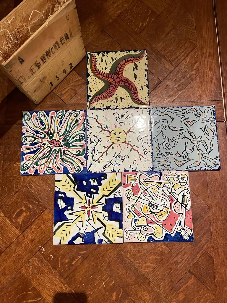 “La Suite Catalane”Complete set of 6 painted and glazed ceramic tiles after paintings by Salvador Dali´ (1904-1989)Spain, 1954. Stamped 1954 versoManufactured by El Siglo, Onda in Spain.Six tiles titled ‘El beso fuego’, ‘Las guitarras’, ‘El sol vegetal’, ‘La estrella de mar’, ‘Palomas’ und ‘Flechas’Dimensions: each 19.8 x 19.8 cm 8" x 8".The tiles are in very good condition with original wooden box with hay.