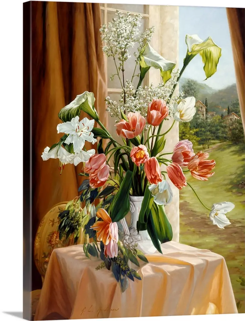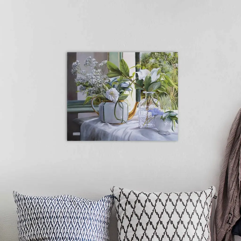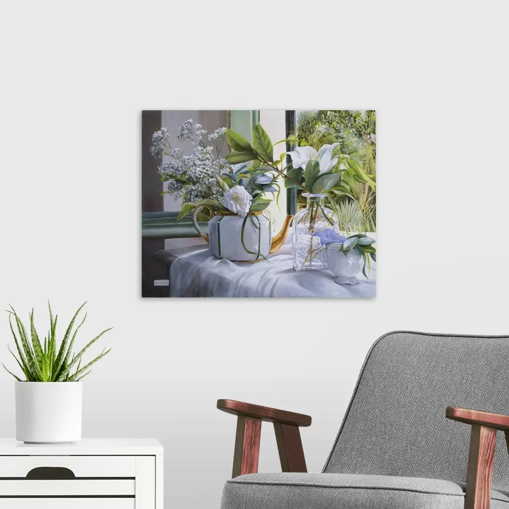Contemporary still life painting of a teapot and glass vase filled with flowers.