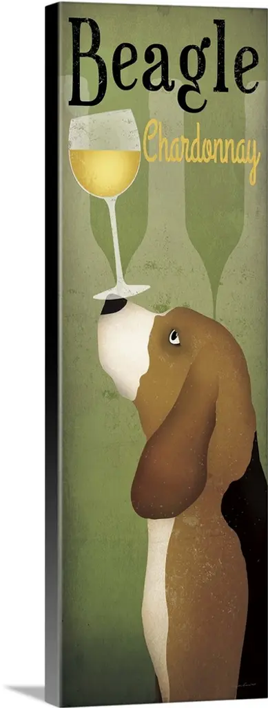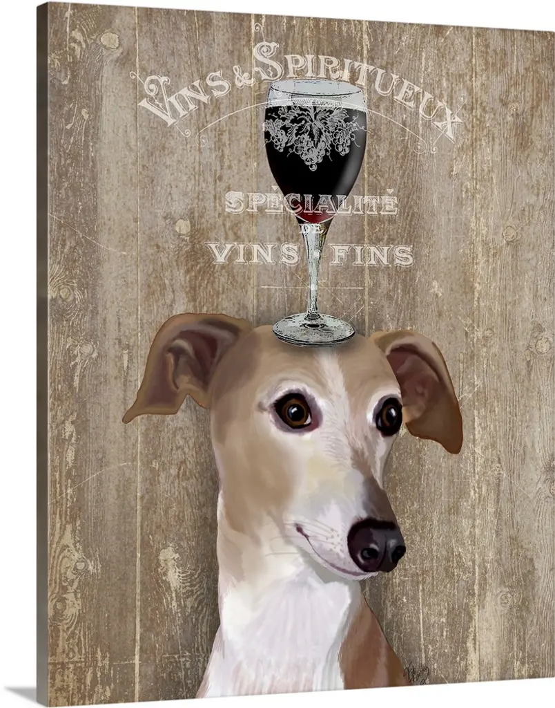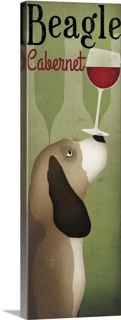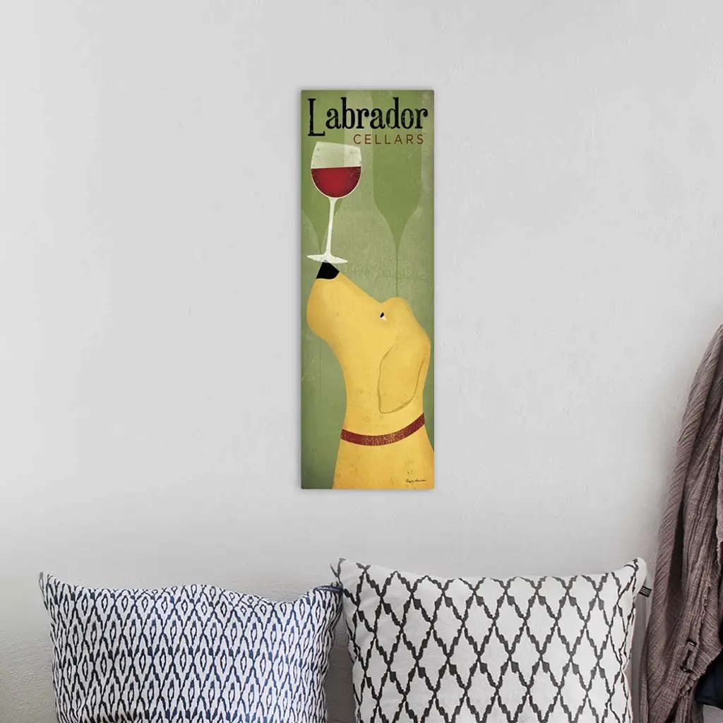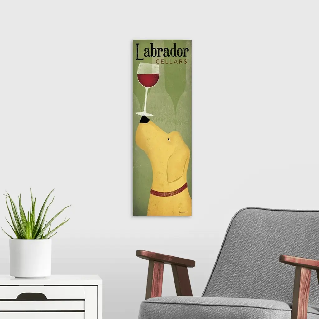 This large vertical piece is a contemporary painting of a yellow lab holding a glass of red wine on it's nose.