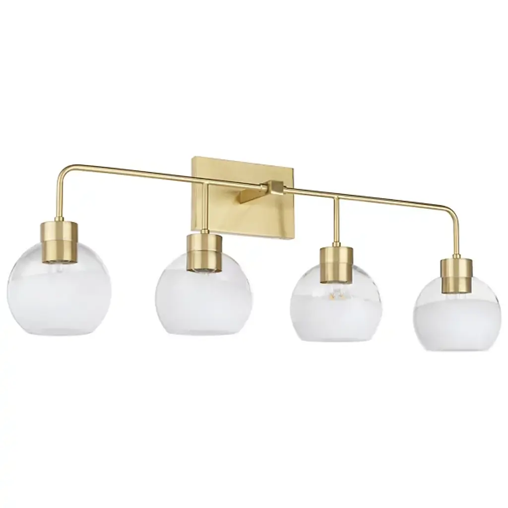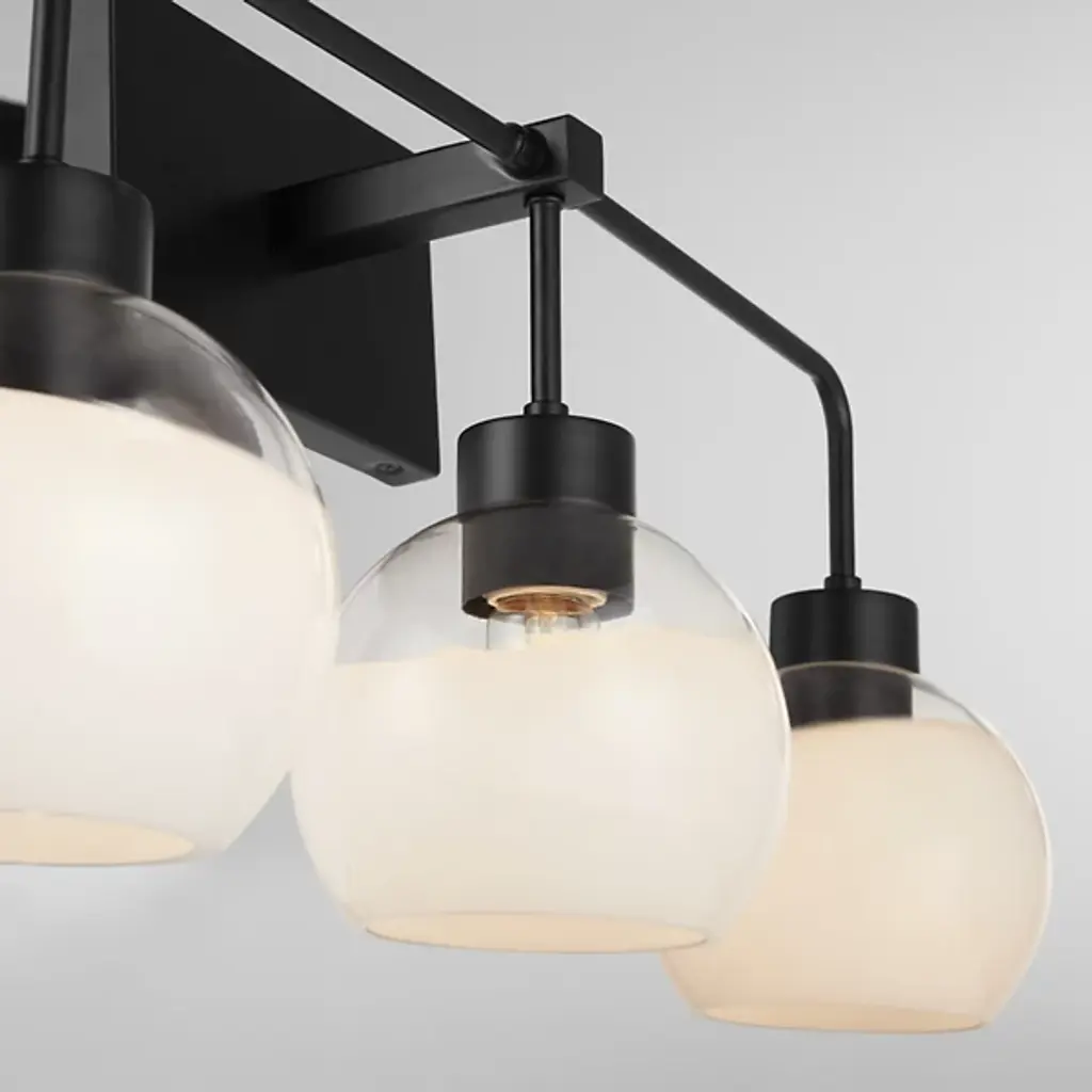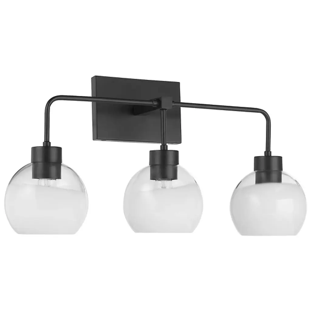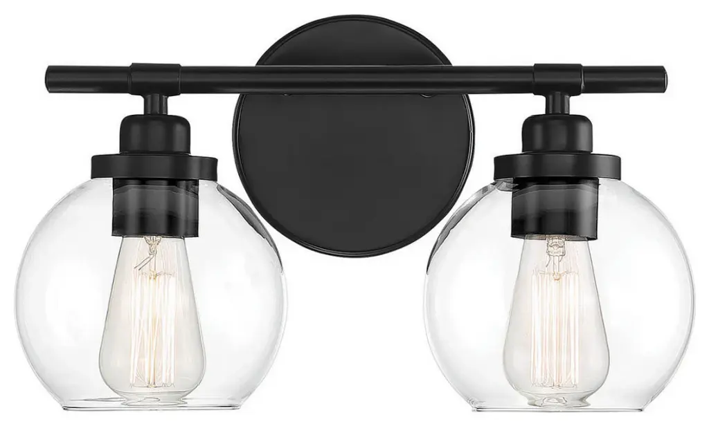 Simple and refined, the Lacy Vanity Light from Quorum International provides a welcoming layer of light to your home that works well in bathroom spaces or under covered patios. A simple square backplate extends a brief arm that mounts two thin, gracefully curving lines that lead to bowl-shaped clear glass shades. The glass contains a seeded texture on the surface and a single downward-facing bulb within. The light plays with the texture on the glass to create a unique, pleasing ambiance.