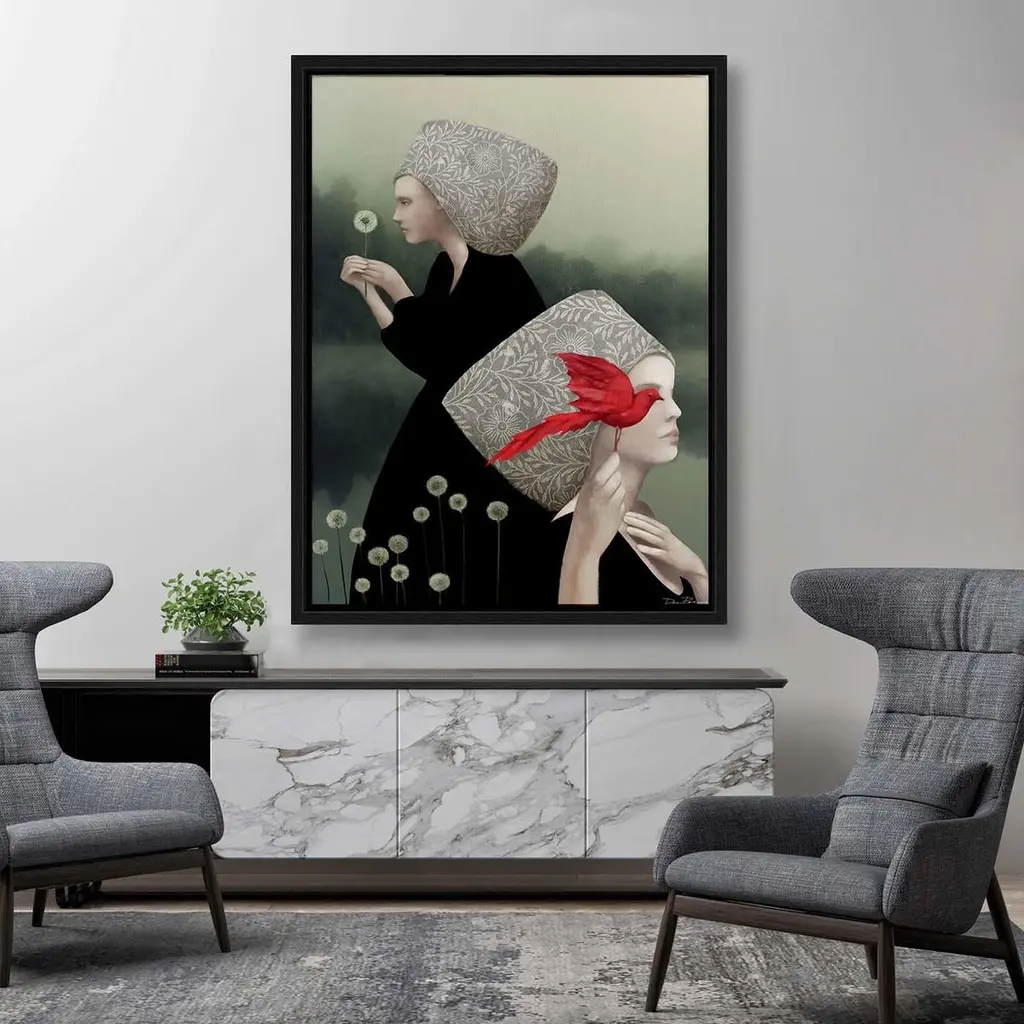 Painted in a Pop-Surrealist style, this digital painting depicts two women on the misty shores of a lake. Adorned in elegant, unusual head coverings, one holds a dandelion, with the other clings to a stately red bird, representing her otherworldly imagination. Signed, numbered Limited Edition with "Certificate of Authenticity". Canvas mounted on spruce with basswood box frame.