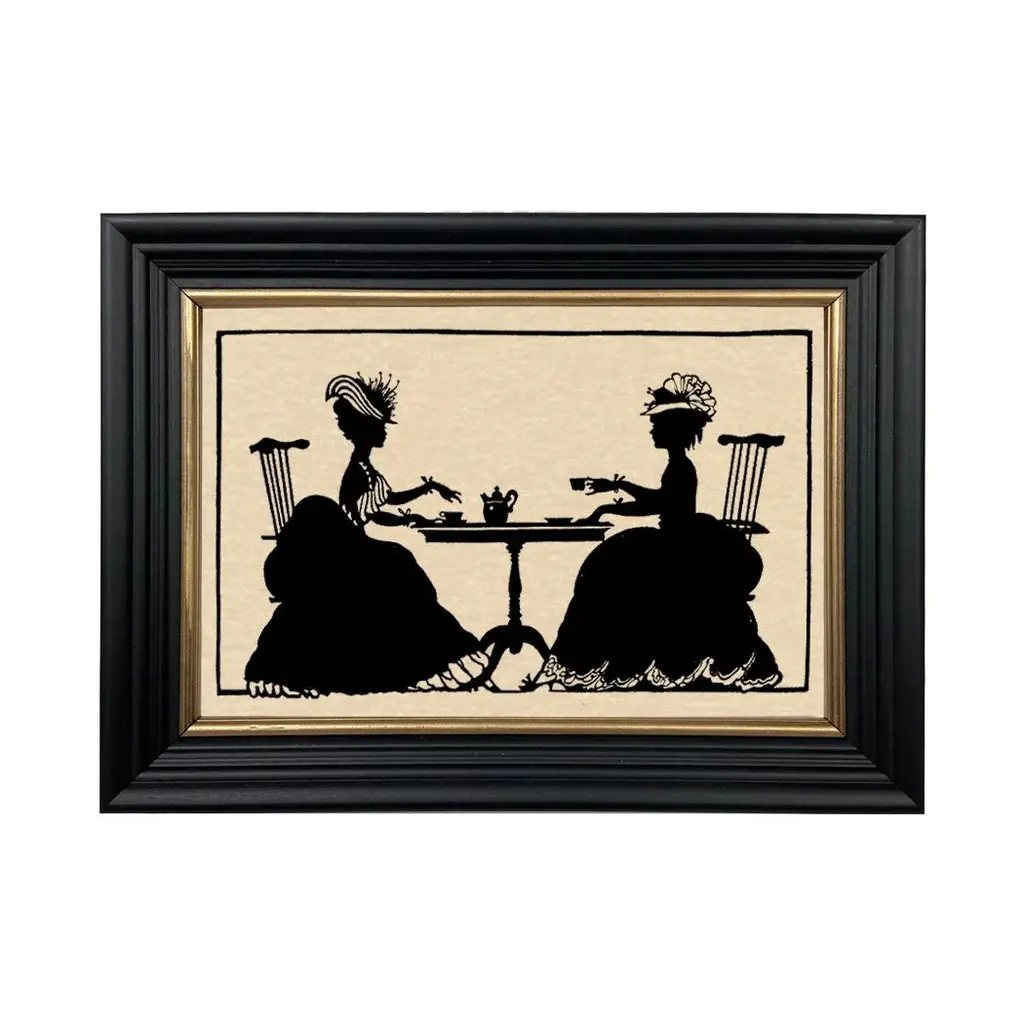 Enhance and decorate your home with our paper cut silhouette featuring two Victorian ladies enjoying afternoon tea. Quality materials and hand craftsmanship....entirely from the USA! This paper cut silhouette is behind glass in a 8.75" x 12" black, solid ash wood frame with gold trim. A saw tooth picture hanger is attached to the back. - Paper cut silhouette - Handmade in USA - 8.75" x 12" black, durable, solid ash frame with gold trim - Special aged paper gives an antique appearance - Attached saw tooth picture hanger on back