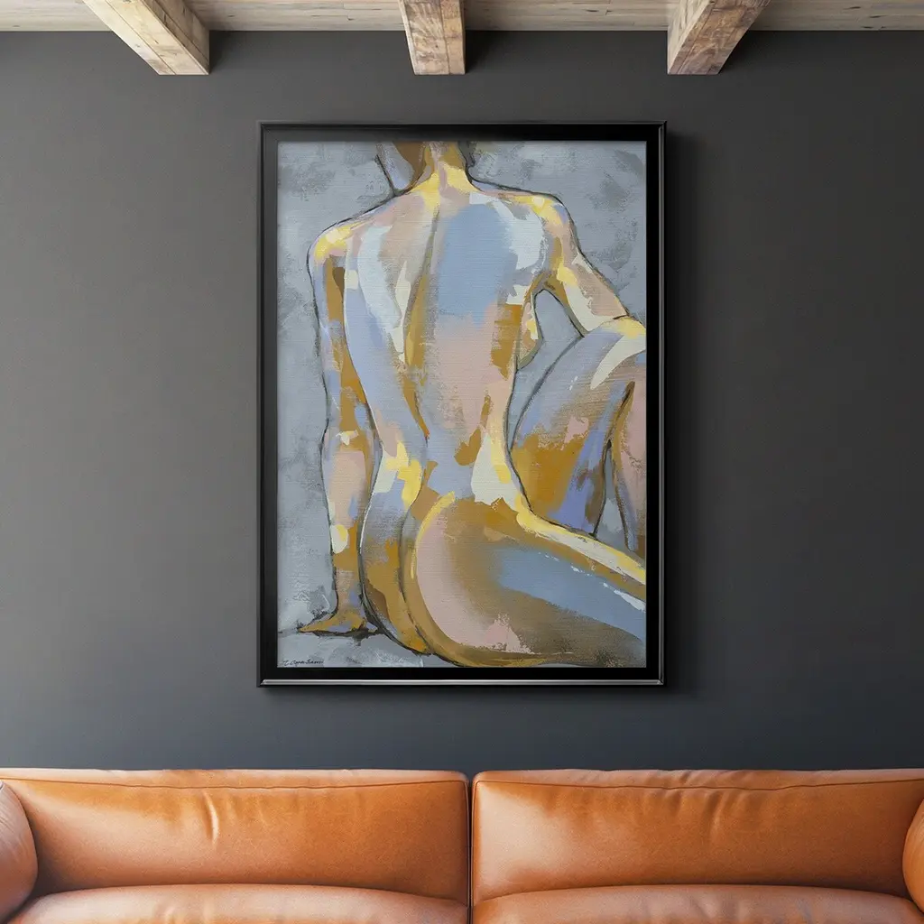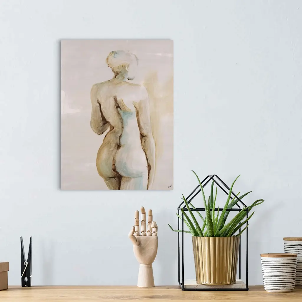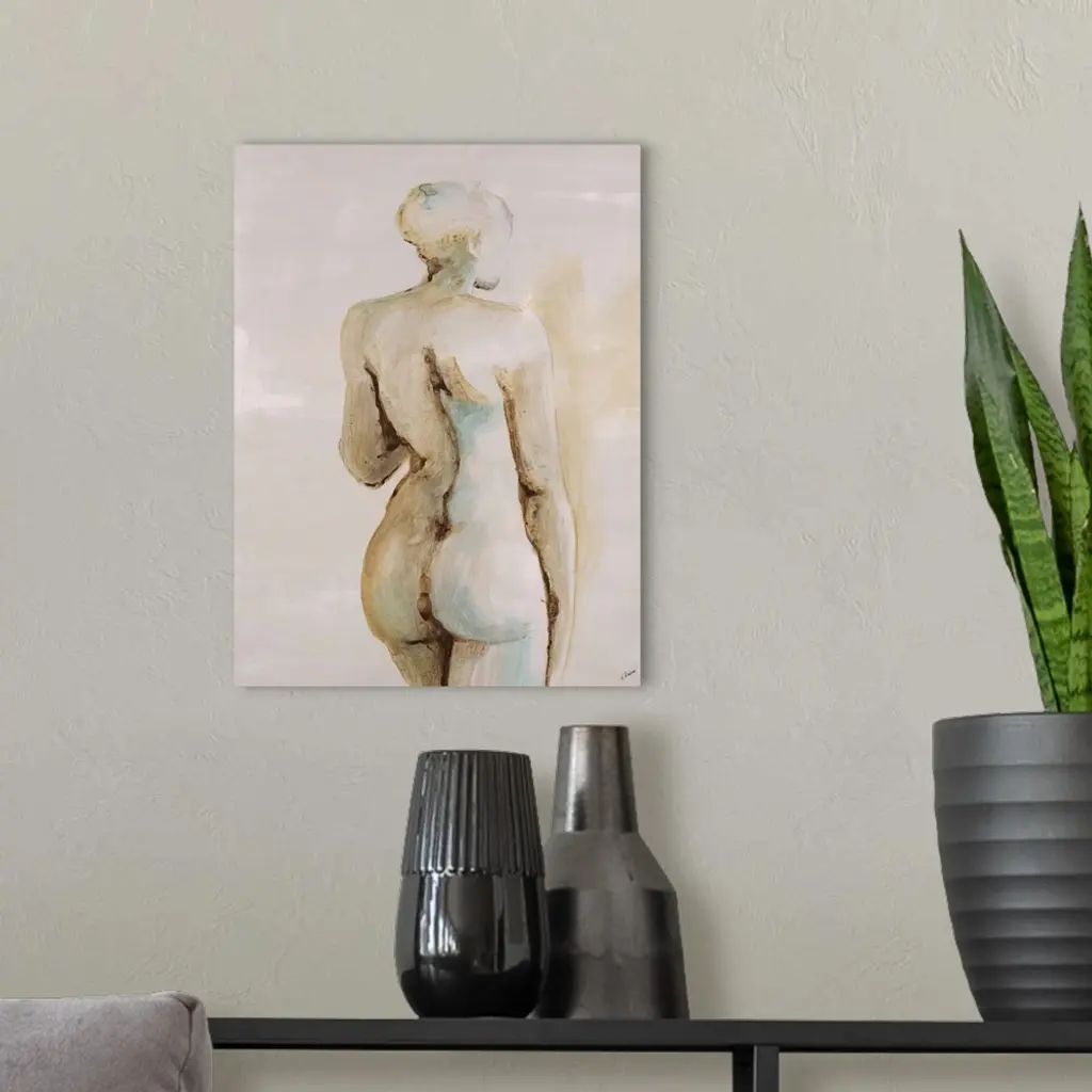 Contemporary figurative painting of a nude female standing with back facing viewer.