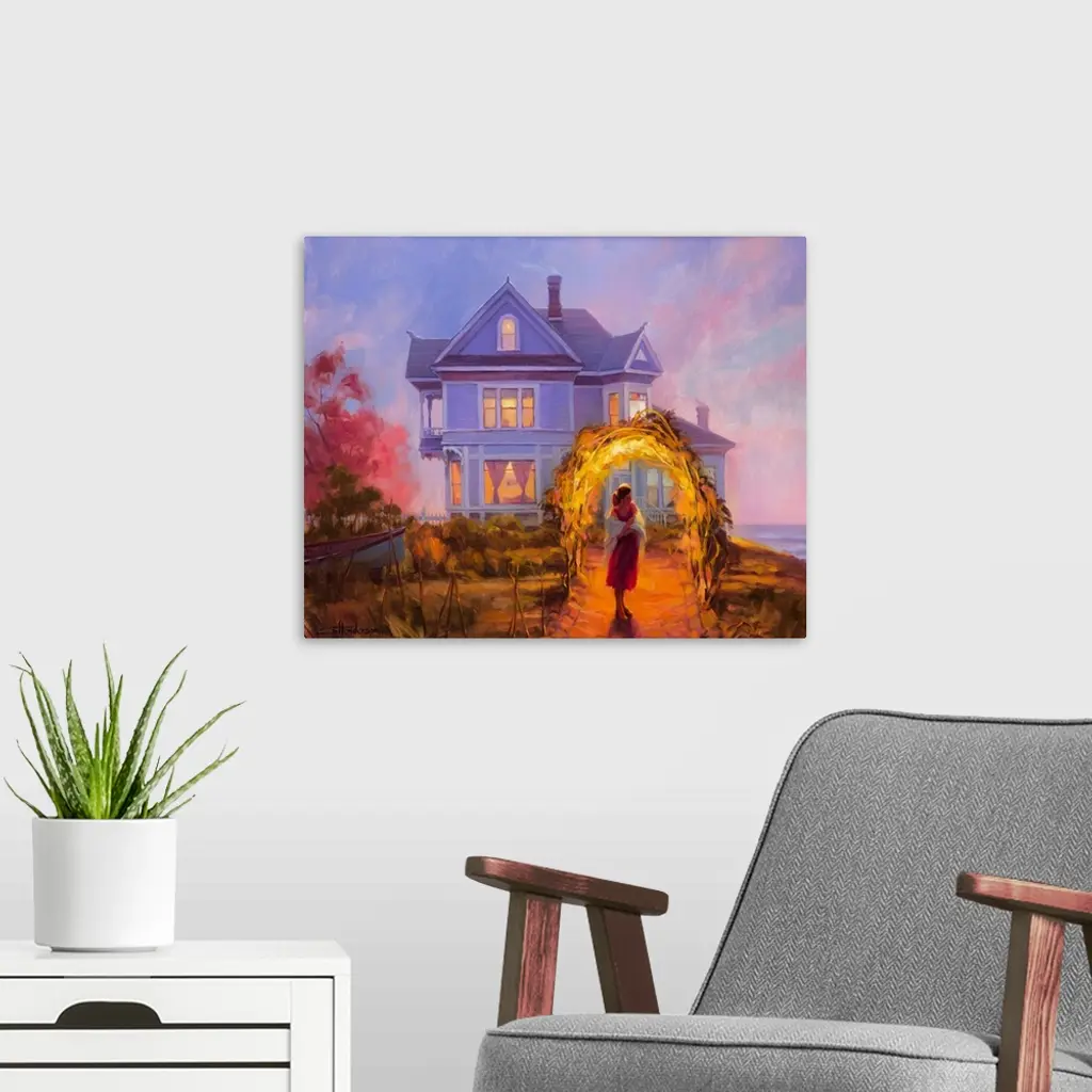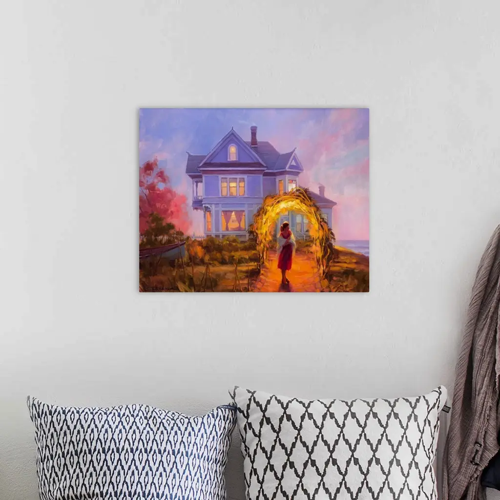 Traditional representational painting with lavender hues of a woman in a shawl, waiting under an archway on a coastal sunset evening
