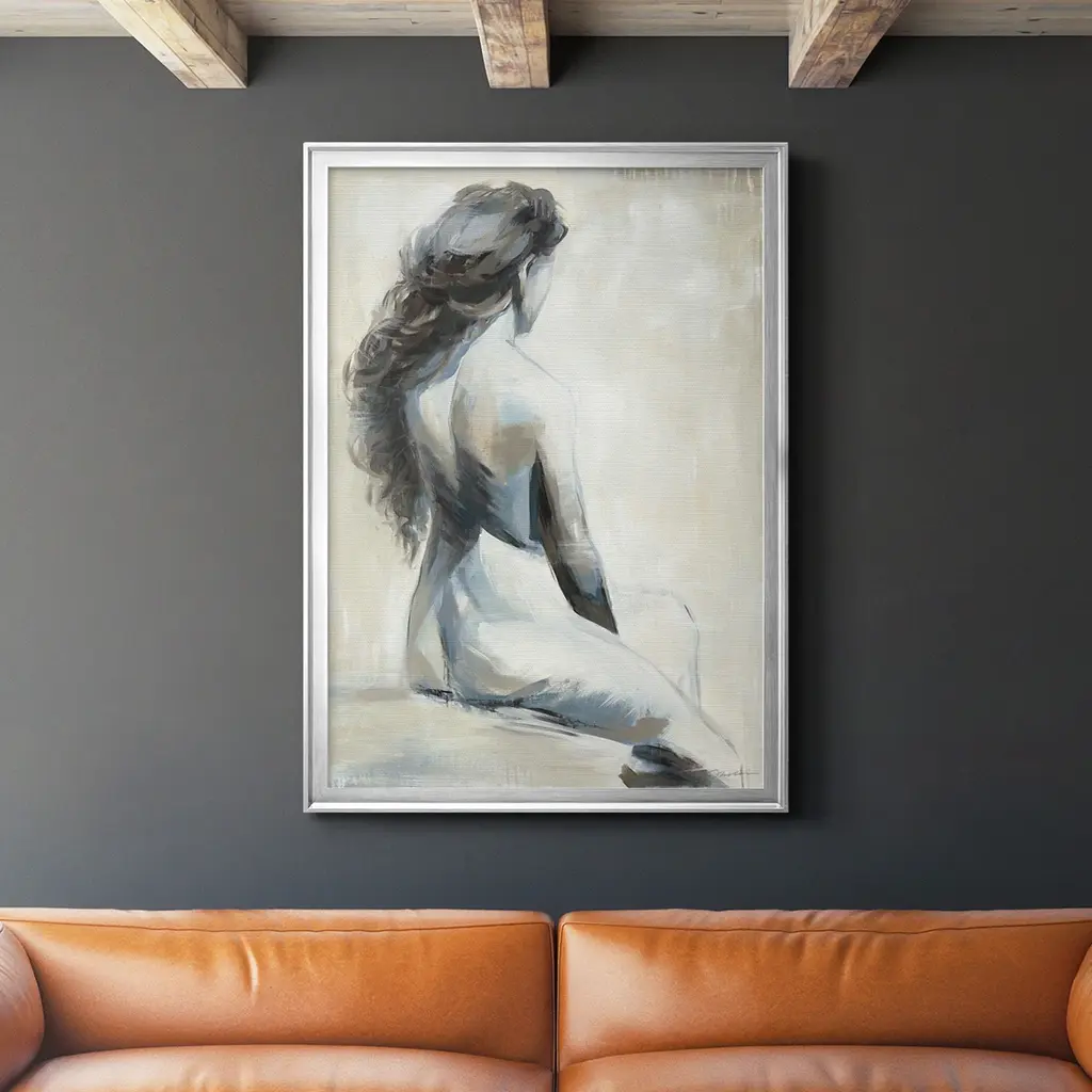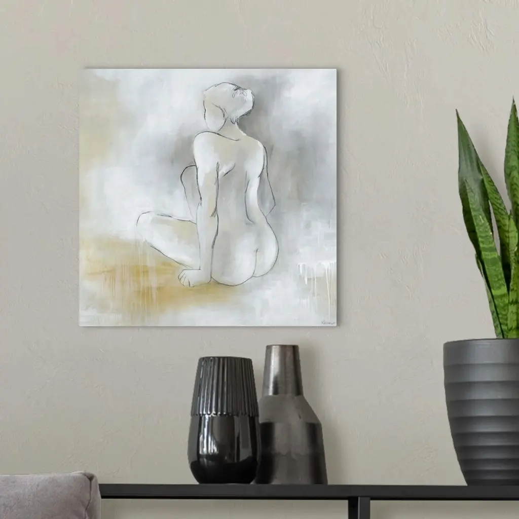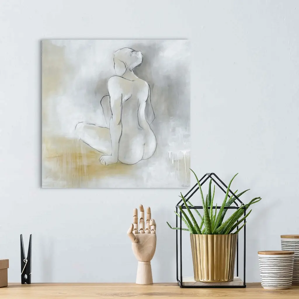 Contemporary painting of a seated nude female figure against a pale neutral background.