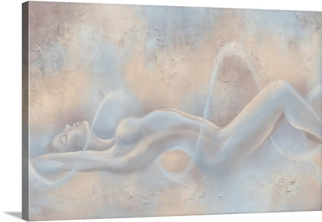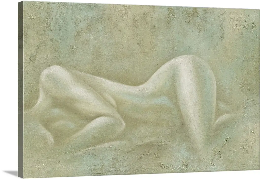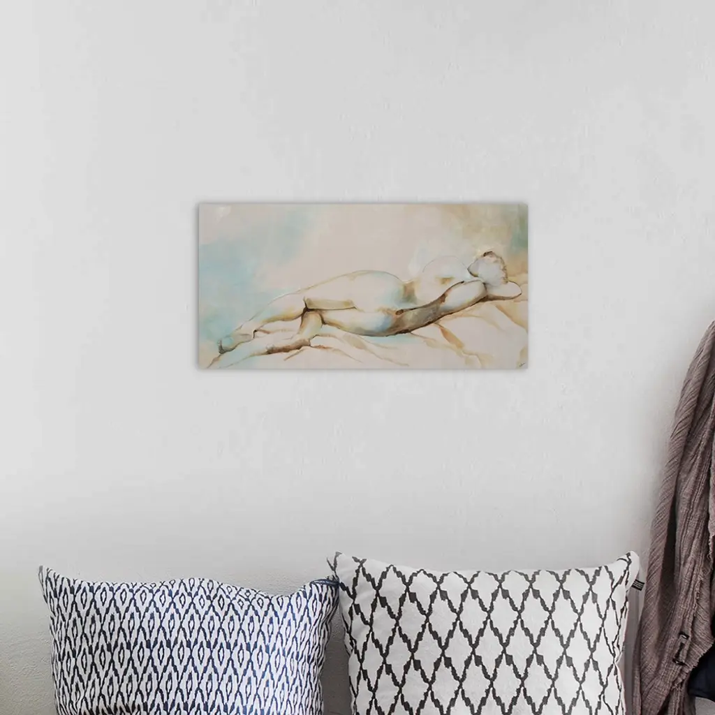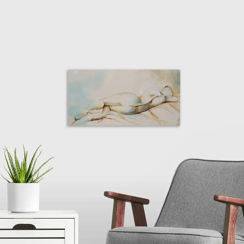 Contemporary figurative painting of a nude female laying down, with back facing viewer.