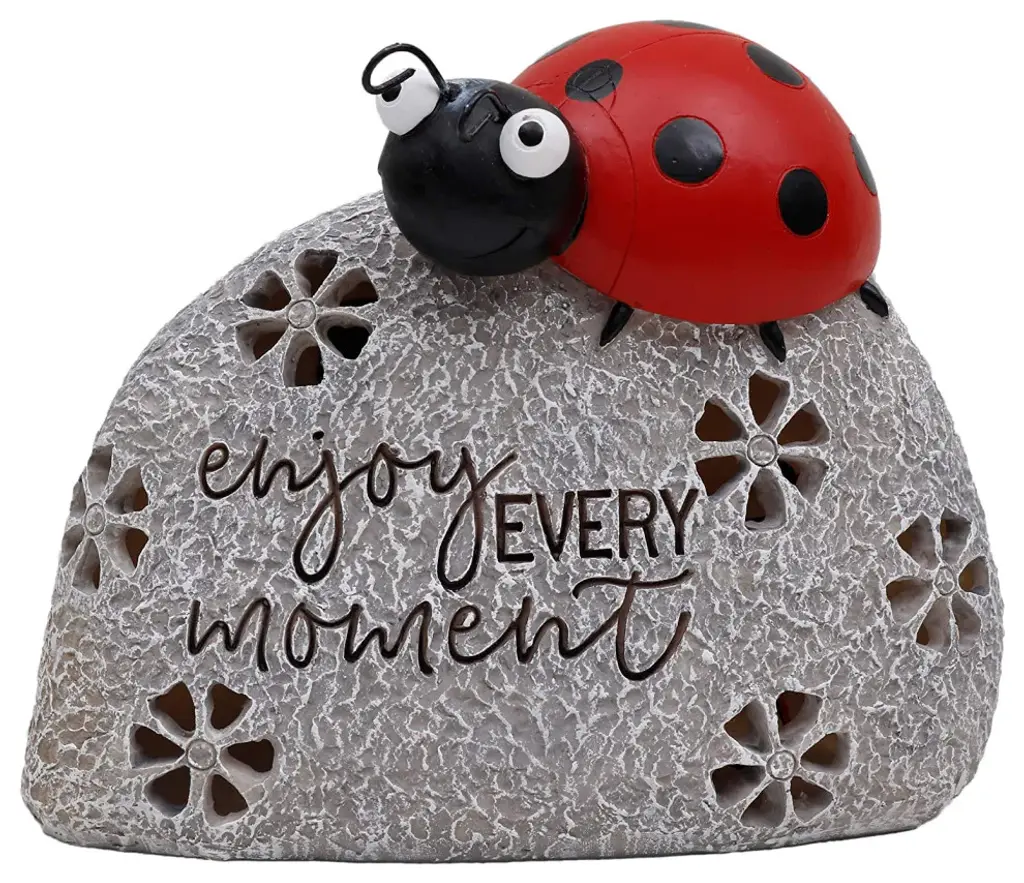 Features:Original Design : This funny ladybug lying on the stone, it has adorable huge eyes, a smile on its face is telling you Enjoy Every MomentPremium Quality: This garden statue made of durable resin materials, waterproof and anti-fading. The product is equipped with advanced solar chips, which can light up for 8 hoursExquisite Craftsmanship: Each product is sculpted and molded by skilled technicians, and the exquisite effect of the product is highlighted by hand painting and hollow carvingSolar Light: Please turn on the button at the bottom of the statue before use. Then keep it under the sun to ensure sufficient sunlight. Charging in the daytime and automatically lights up at nightApplication: This ladybug figurine is 6.5 x 3.3 x 5.1 inches, suitable to use as garden, outdoor, patio, lawn, yard, and many areas of your house, also an excellent gift