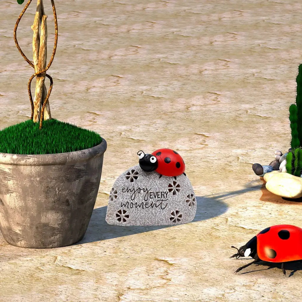 Ladybug On Stone Garden Statues With Solar Powered Lights