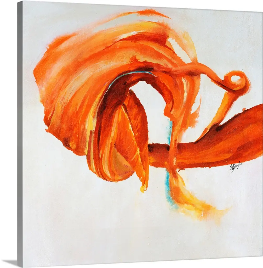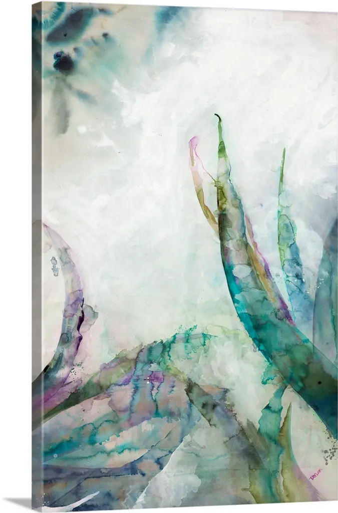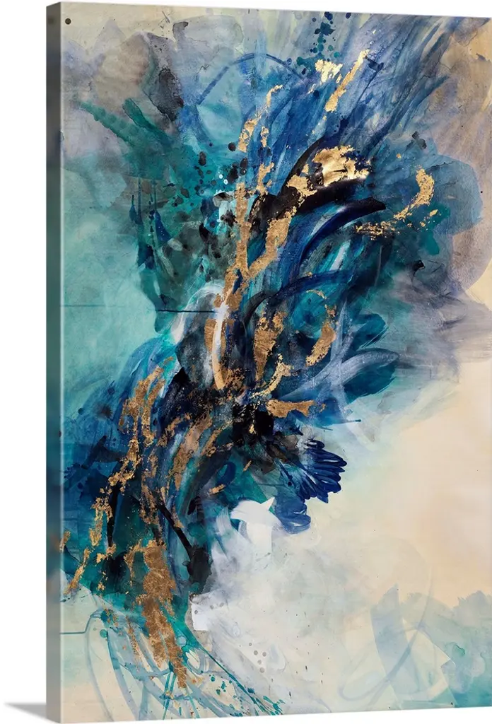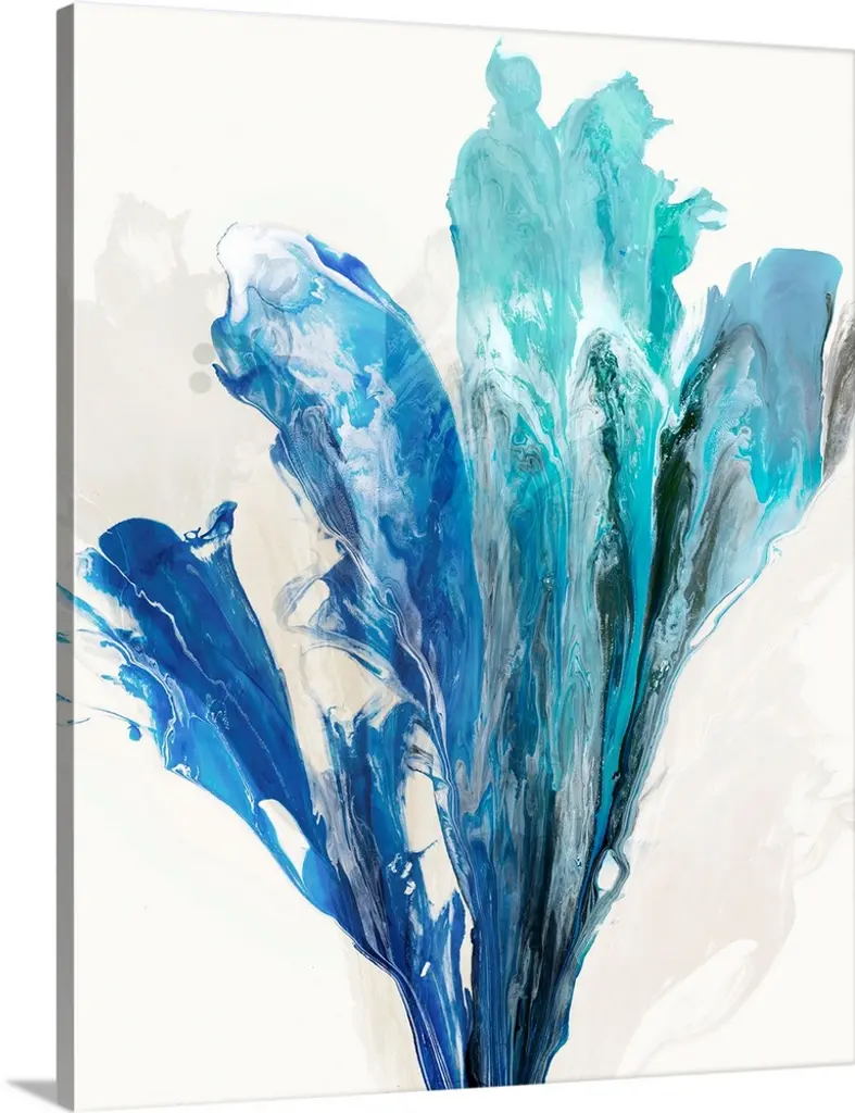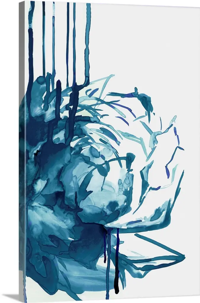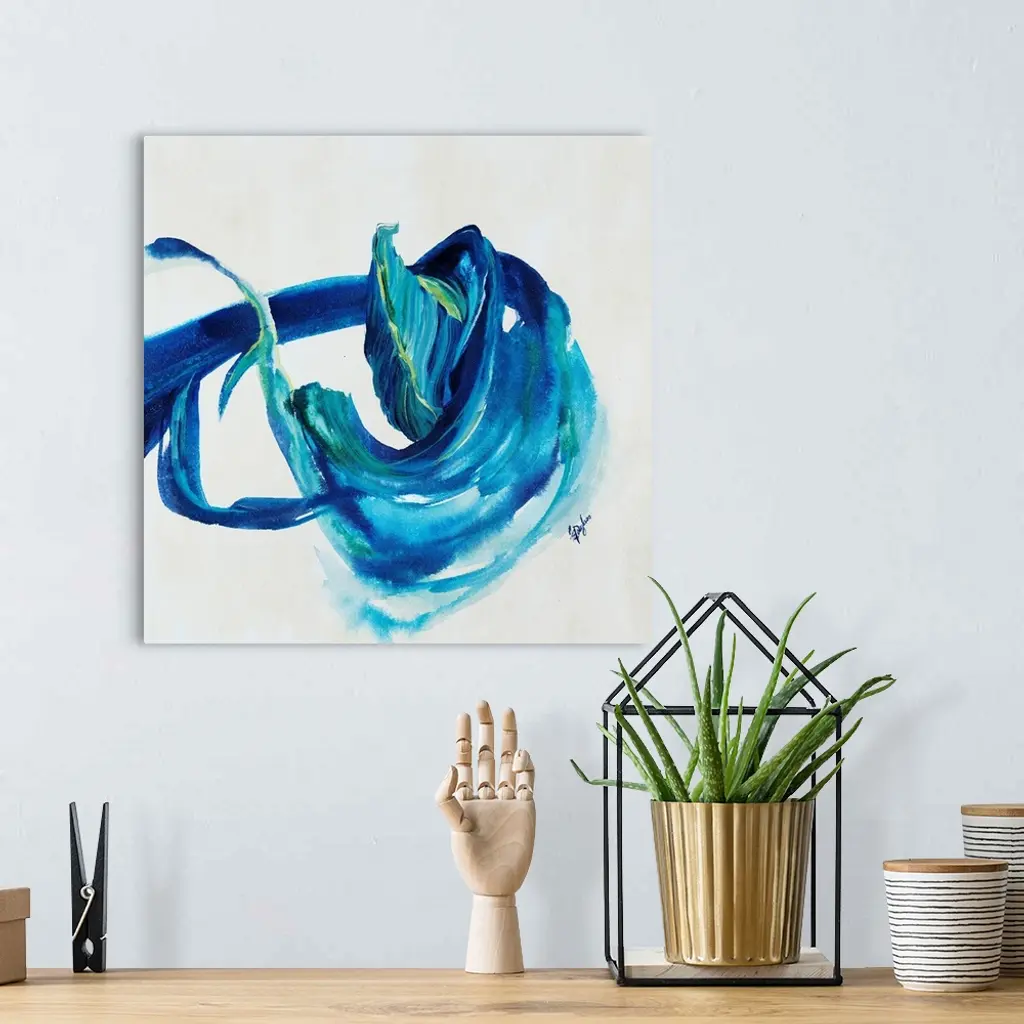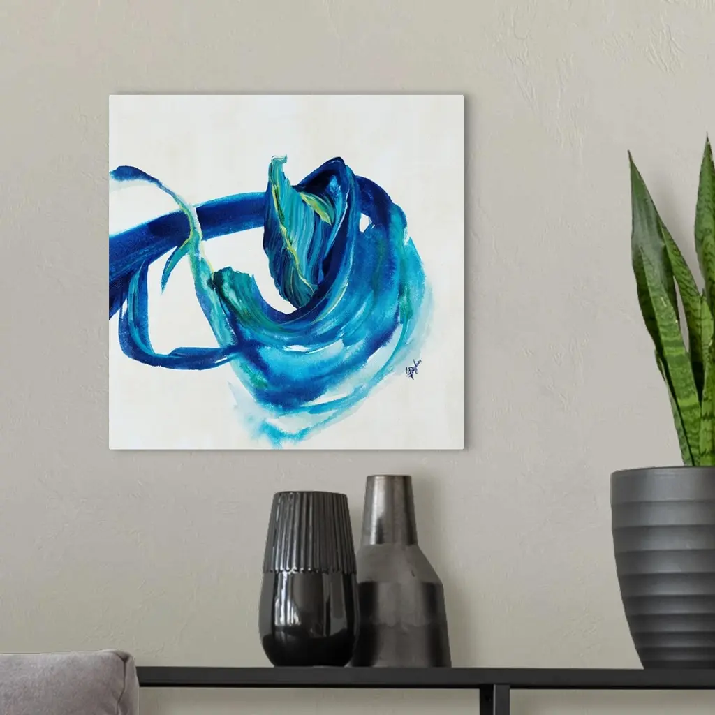 Contemporary painting of an energetic form painting in various shades of blue with hints of yellowish-green.
