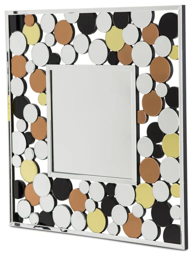 The Lagunaria Graphic features a dynamic array of stainless steel plates hung within the boundaries of a thick black frame. Designed to catch and reflect the light, this piece fills any space with a bold, lively presence.