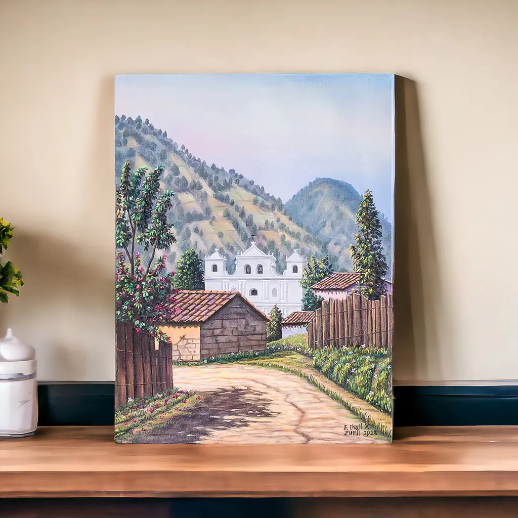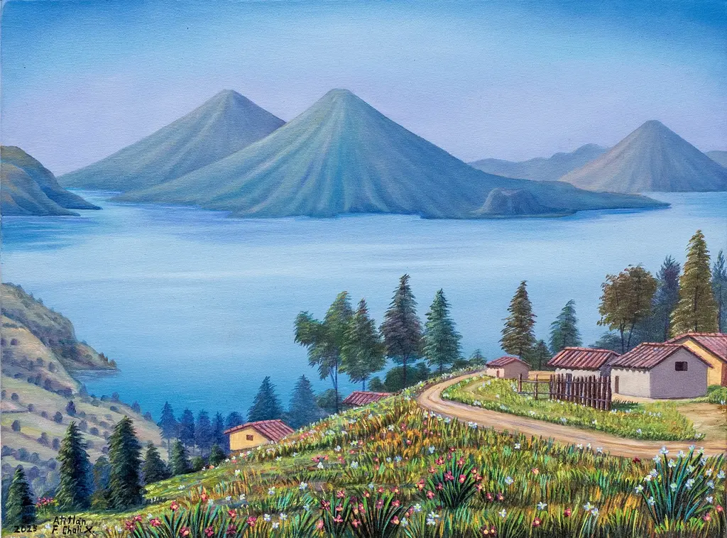 Immerse yourself in the captivating beauty of Lake Atitlán, Guatemala, through this exquisite oil painting rendered in a realist style. The dominant peaks of the Atitlan, Toliman and San Pedro La Laguna volcanoes command the horizon set against a dreamlike, cerulean sky that Filiberto Chali skillfully diffuses with soft whites, offering a spectacular vista. Gaze towards the lake's edge and discover a rustic road, winding its way to a lovely village. Detailed brushstrokes bring to life verdant crops, wild grasses, towering trees and a kaleidoscope of colorful flowers, all interspersed with charming, tile-roofed cottages peeking through the rich foliage.Titled Lago de Atitlán in Spanish.