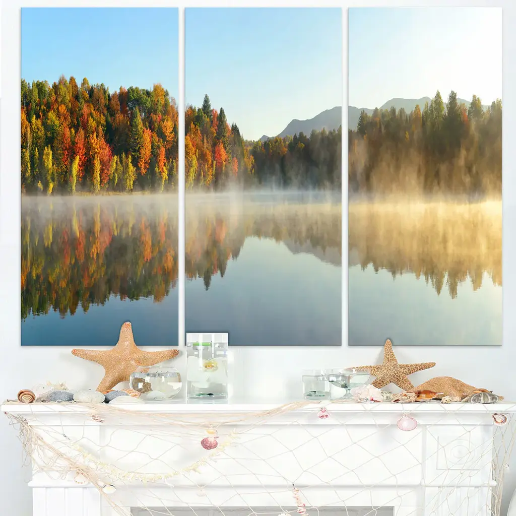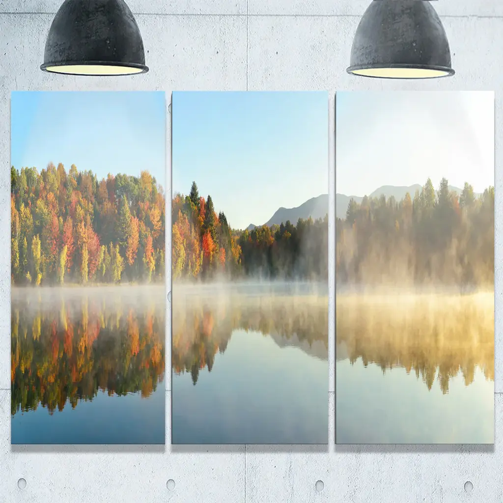 "Lake Autumn Foliage Fog Panorama" Metal Wall Art, 3 Panels, 36"x28"