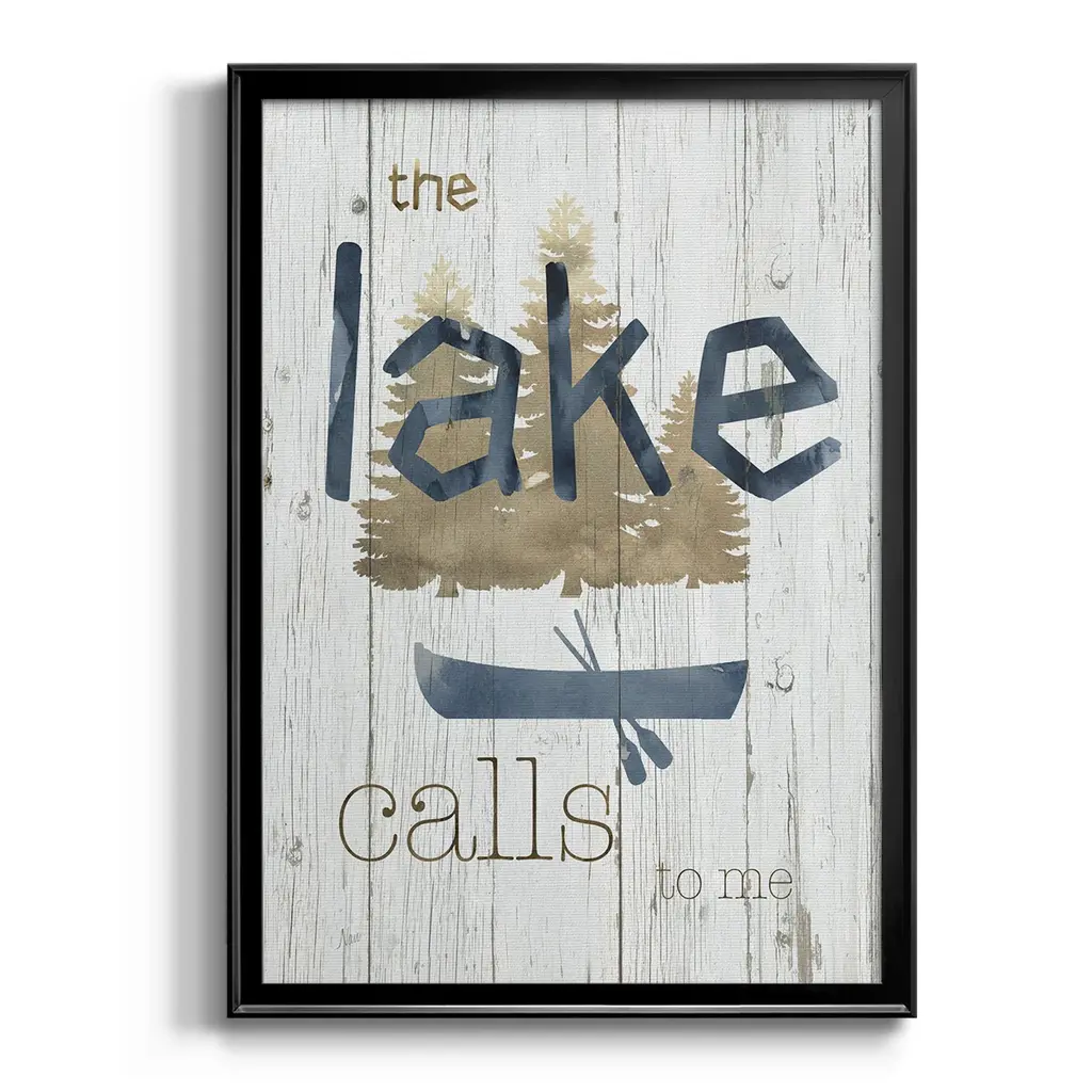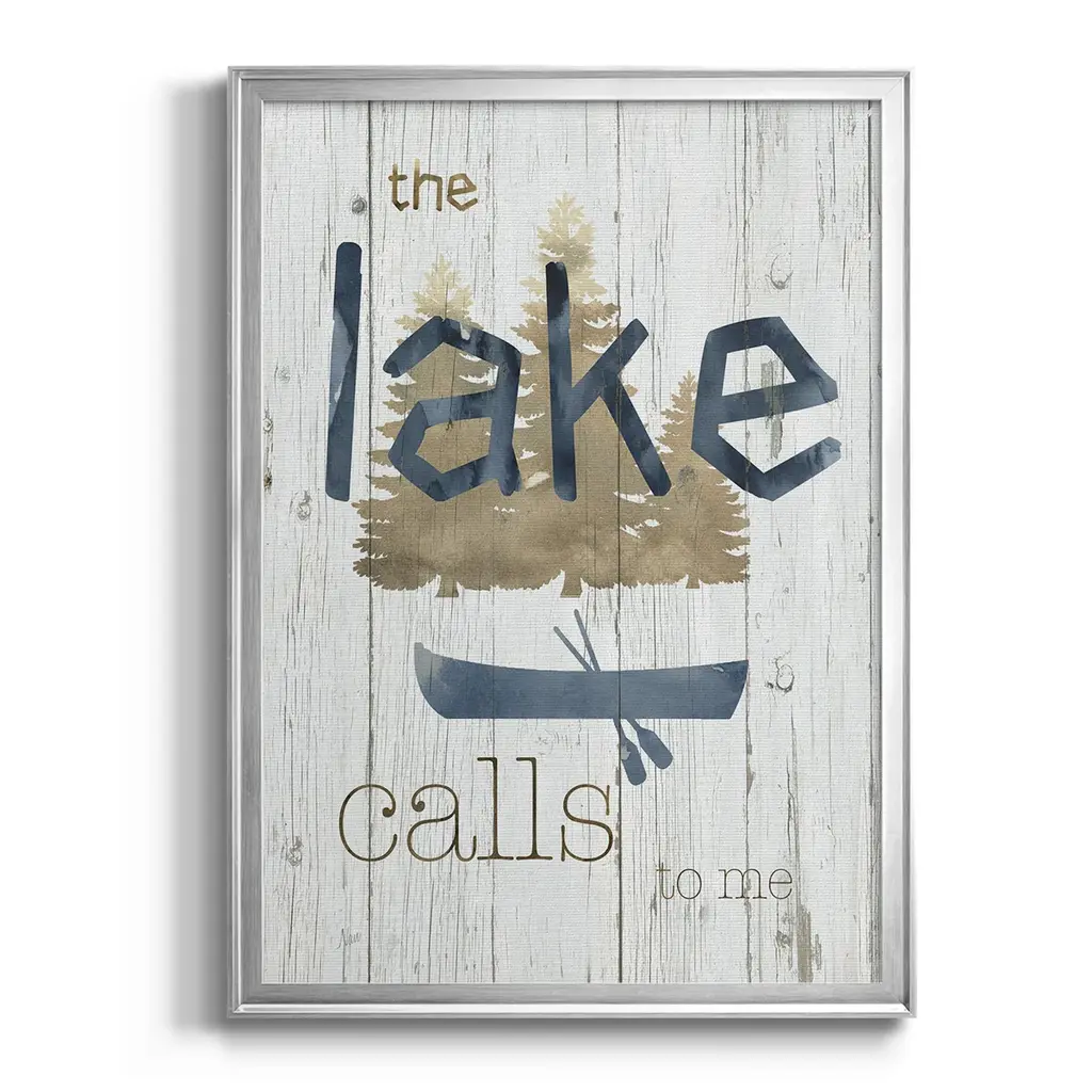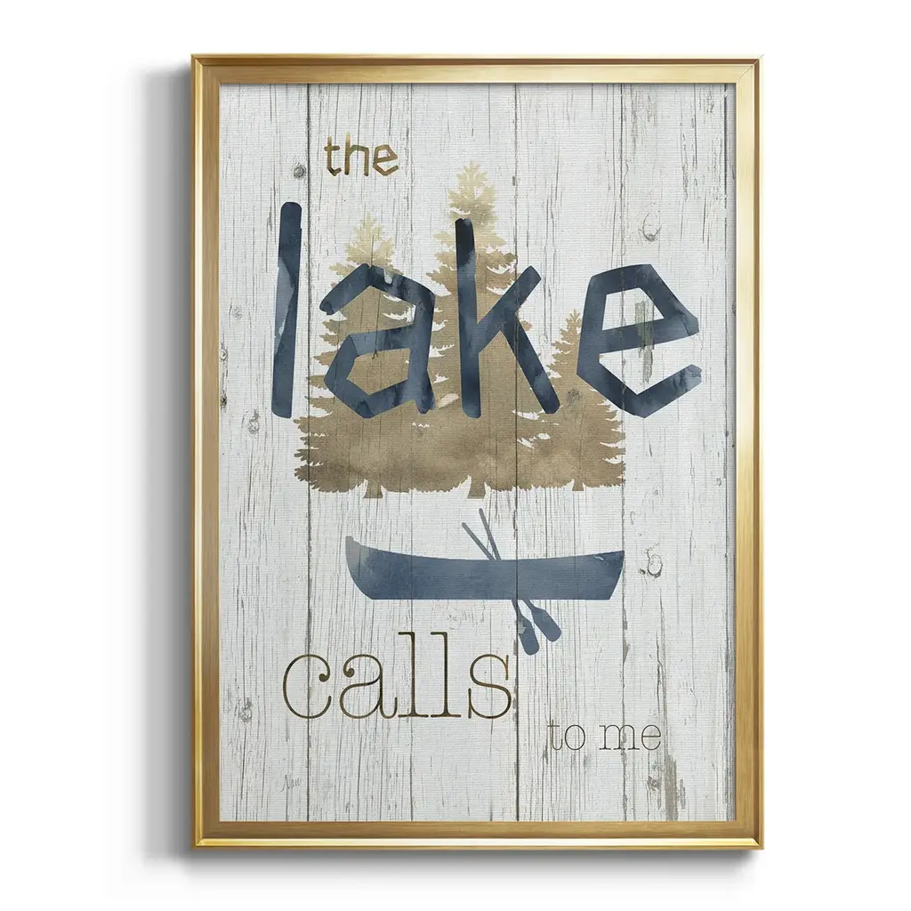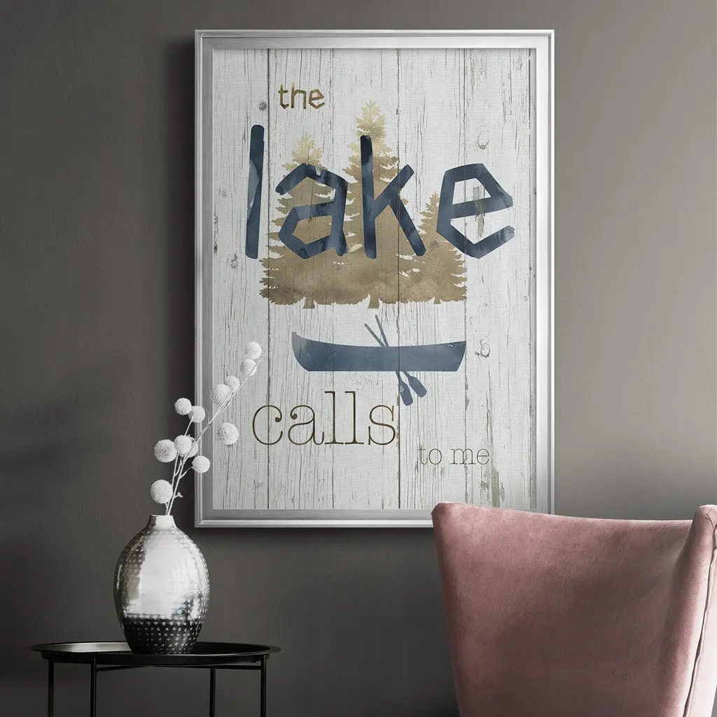 Lake Calls Me Premium Framed Print - Ready to Hang A Premium Framed Print created to last. Framed in distressed wood and available in an array of sizes and colors Featuring a beveled a solid wood stretcher bar, each piece comes ready to hand 4 SIZES AVAILABLE 30.5''X42.5'' - Overall Size 26.5'X36.5'' - Overall Size 22.5''x30.5'' - Overall Size 18.5''x24.5'' - Overall Size Each piece is made to order. Each piece comes with hanging hardware. Made in the USA Ready to Hang