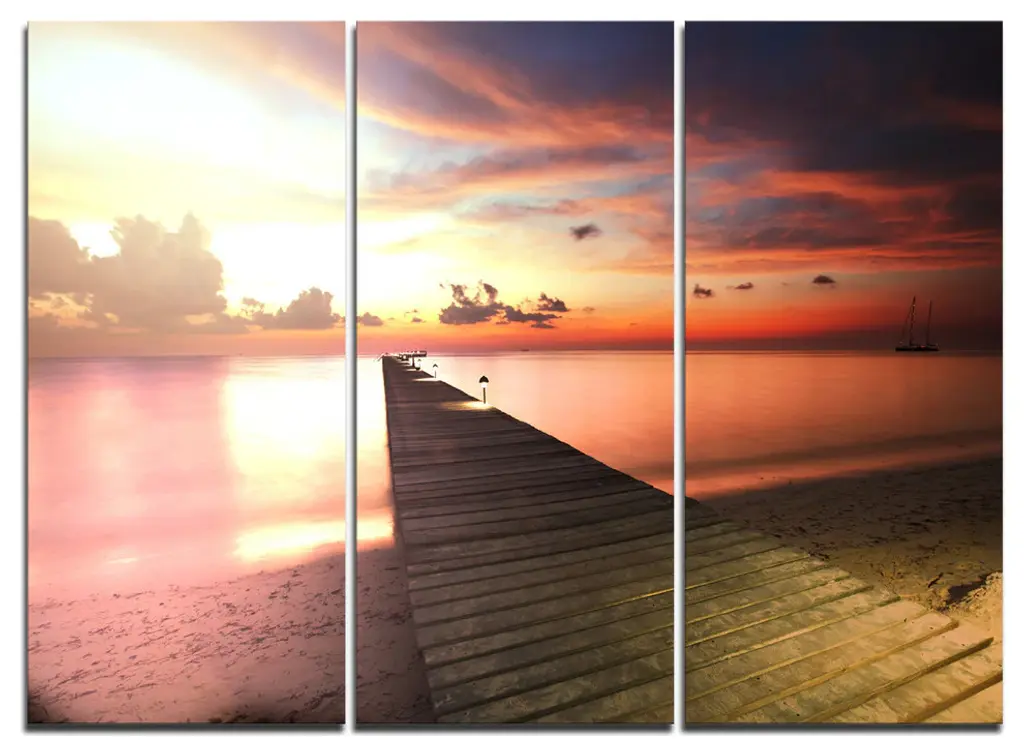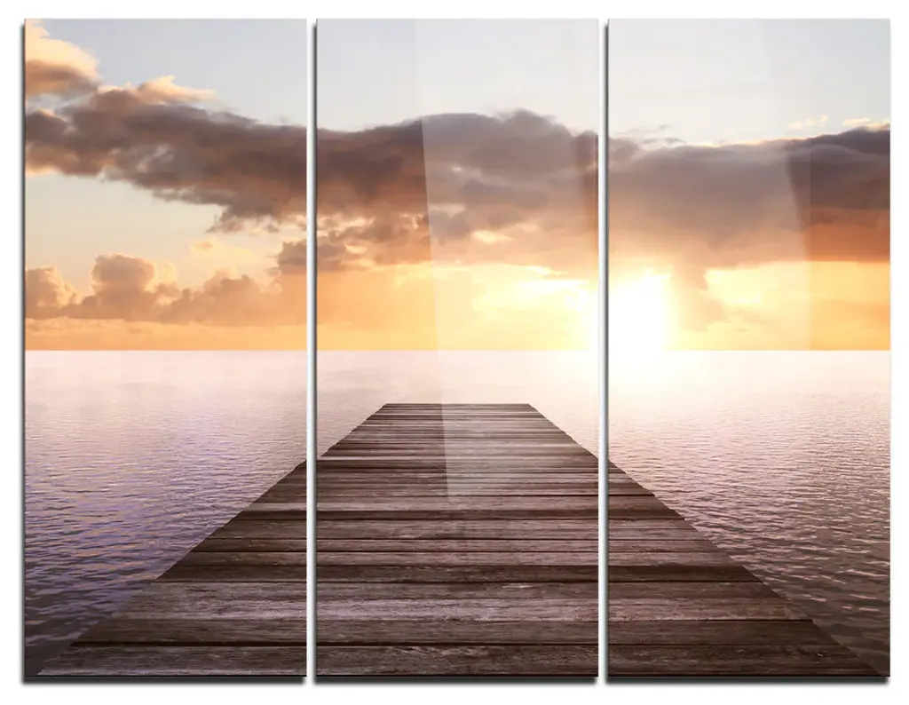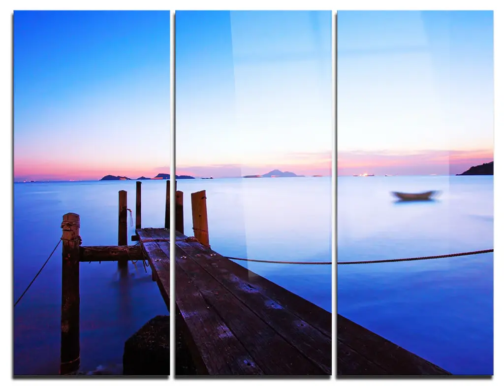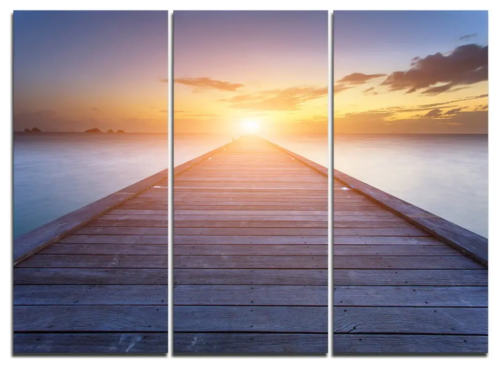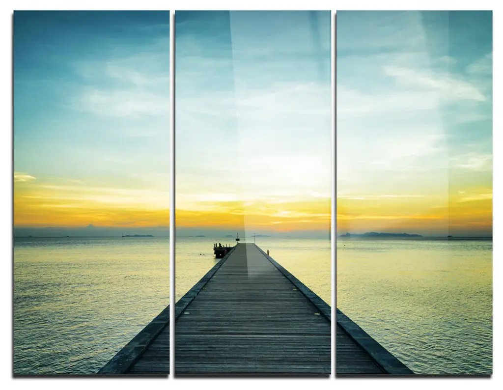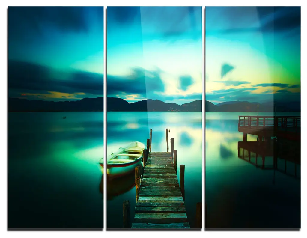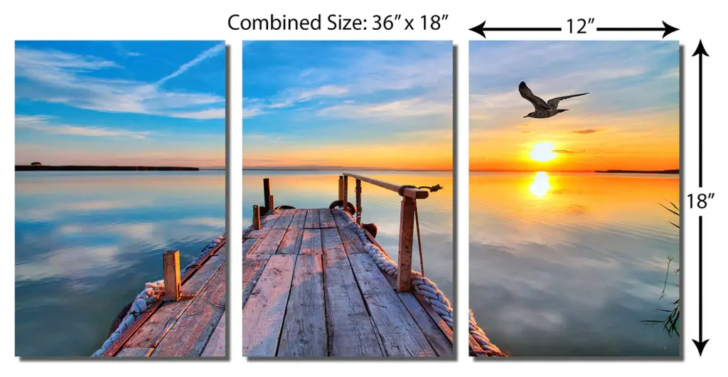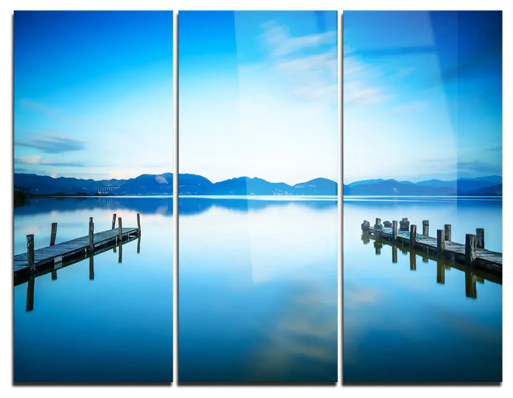 36"œ x 18"œ total size. Ready To Hang! (3 pieces - 12"œ x 18"œ each). 3 Panel Split (Triptych) Metal Print featuring beautiful lake, docks during sunset. Modern metal wall art for home or office wall decor & interior design. Printed on Luxurious, HD aluminum glossy metal panels. Multi panel art.. HD aluminum panels. Metal print wall art. Includes Shadow Wall Mount on the back.• Aluminum Metal Wall Art• Made in USA• Ready to hang - No assembly required• Shadow mount hardware on the back• 0.045"œ thick HD Aluminum Panels• Scratch resistant, glossy finish• Superb color clarity, luxurious prints• Epson printing process• For indoor or moisture rich environment use• Easy to clean. Gently wipe with microfiber cloth.