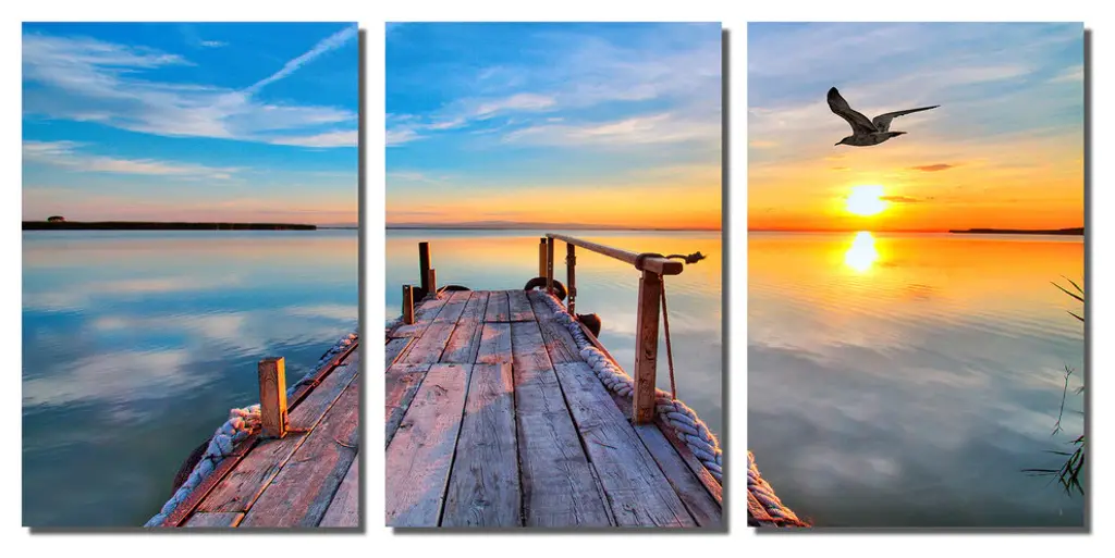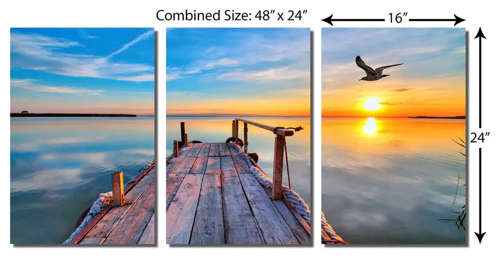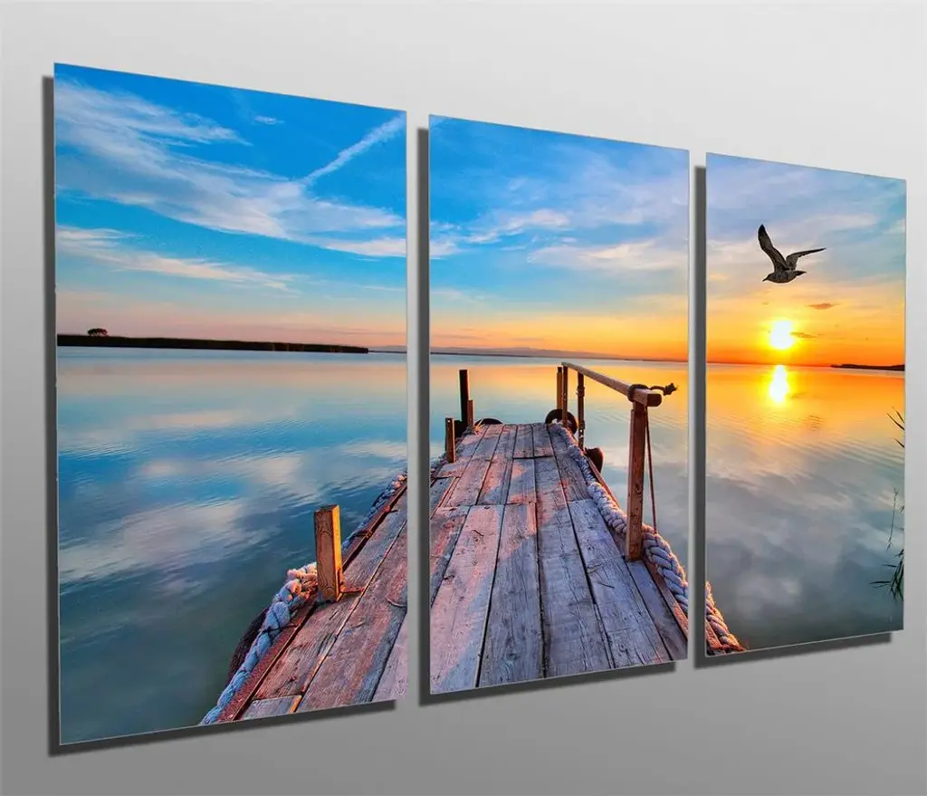 48"œ x 24"œ total size. Ready To Hang! (3 pieces - 16"œ x 24"œ each). 3 Panel Split (Triptych) Metal Print featuring beautiful lake, docks during sunset. Modern metal wall art for home or office wall decor & interior design. Printed on Luxurious, HD aluminum glossy metal panels. Multi panel art.. HD aluminum panels. Metal print wall art. Includes Shadow Wall Mount on the back.• Aluminum Metal Wall Art• Made in USA• Ready to hang - No assembly required• Shadow mount hardware on the back• 0.045"œ thick HD Aluminum Panels• Scratch resistant, glossy finish• Superb color clarity, luxurious prints• Epson printing process• For indoor or moisture rich environment use• Easy to clean. Gently wipe with microfiber cloth.