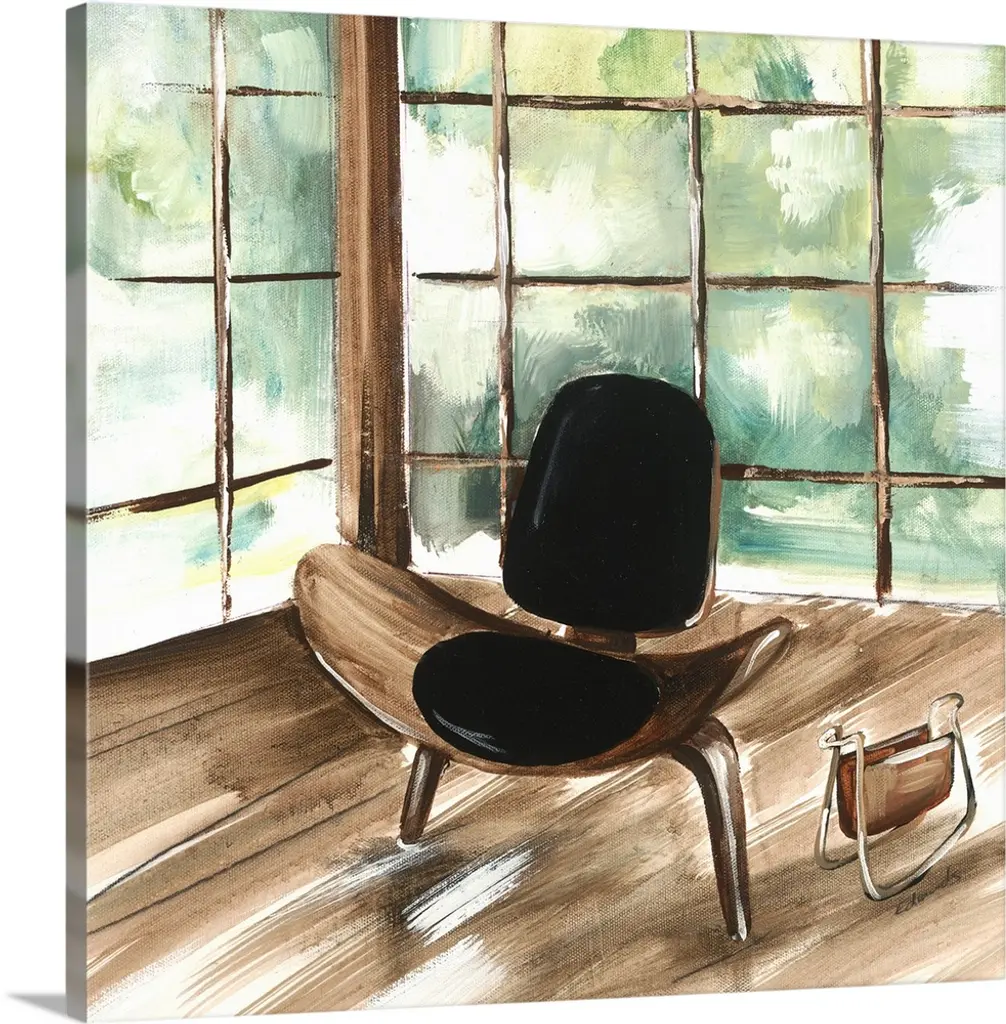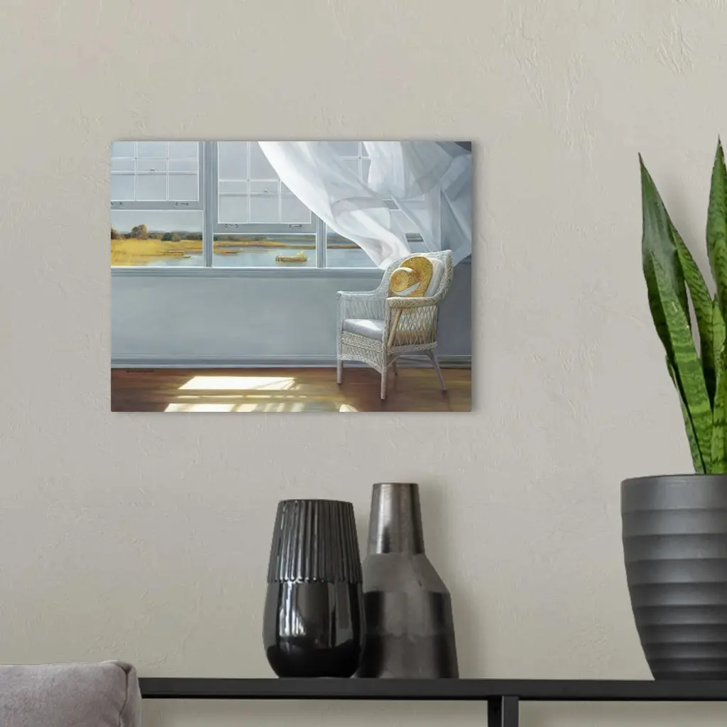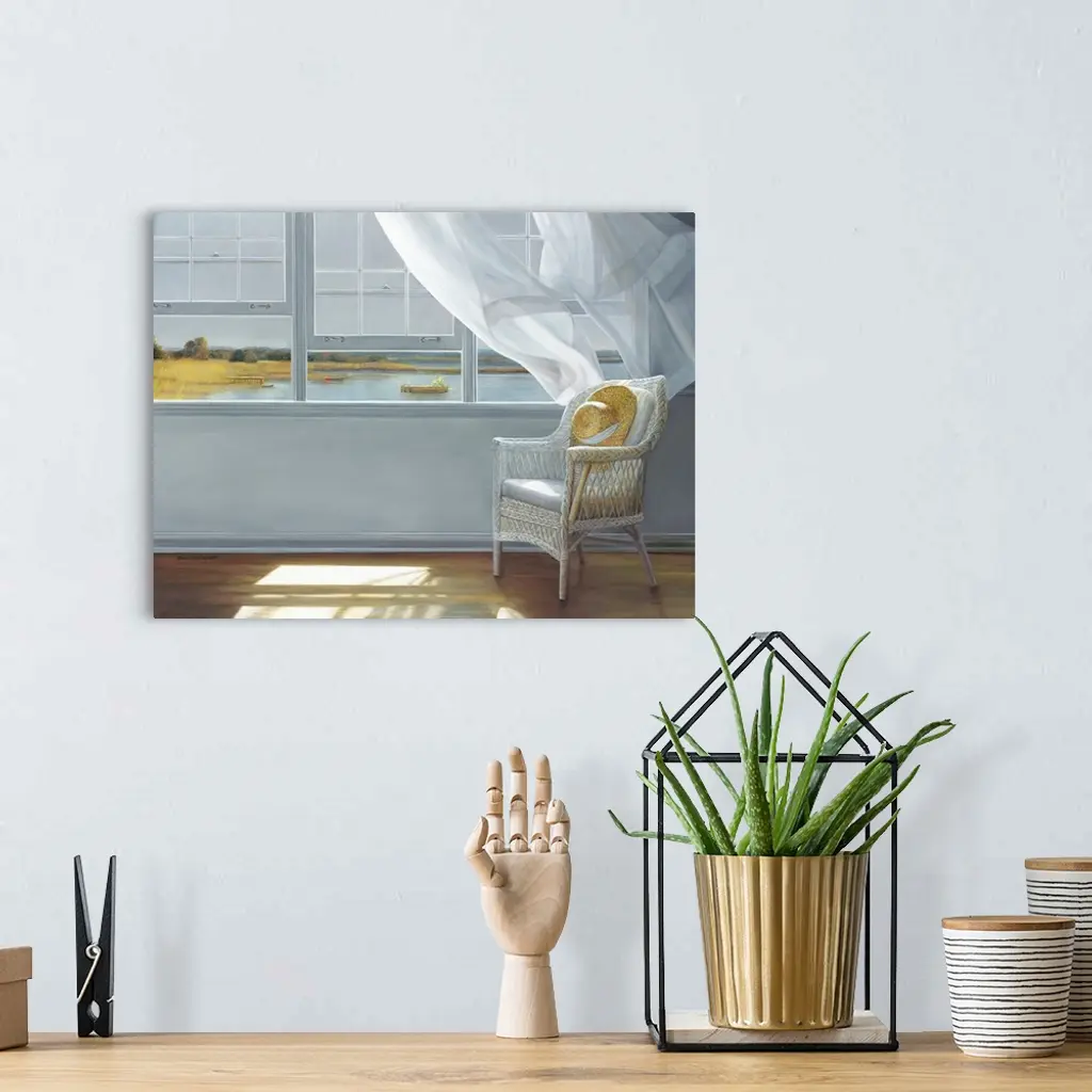 Contemporary still life painting of a hat on a chair next to an open window with a white curtain and the lake outside.