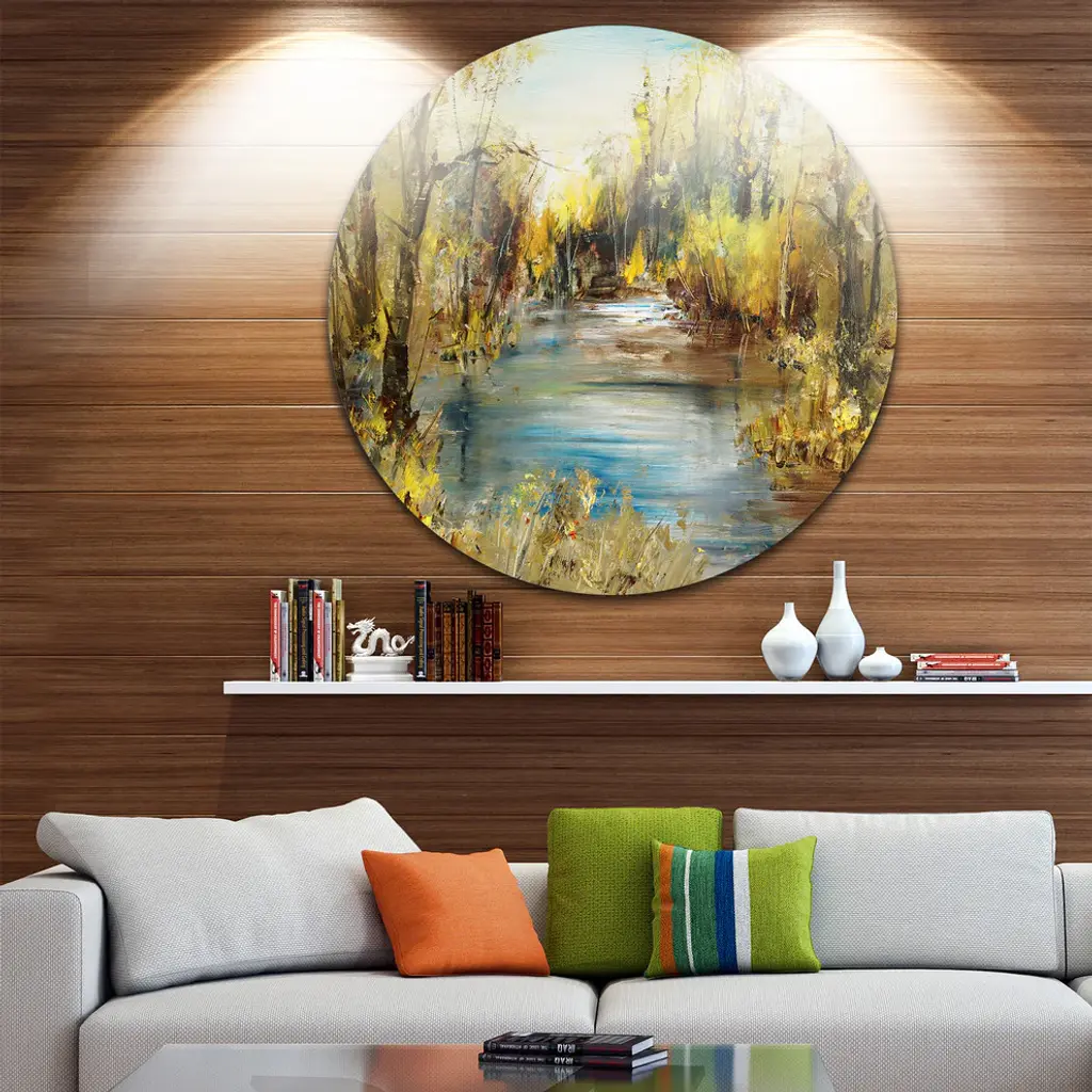 Lake In Forest Oil, Landscape Round Metal Wall Art, 23"