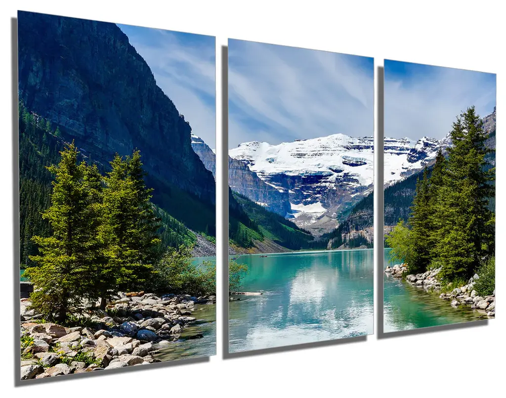 60"œ x 30"œ total size. Ready To Hang! (3 pieces - 20"œ x 30"œ each). 3 Panel Split (Triptych) Metal Print featuring scenic Lake Louise in Alberta Canada, the Canadian Rockies and Victoria glacier. Modern metal wall art for home or office wall decor & interior design. Printed on Luxurious, HD aluminum glossy metal panels. M. HD aluminum panels. Metal print wall art. Includes Shadow Wall Mount on the back.• Aluminum Metal Wall Art• Made in USA• Ready to hang - No assembly required• Shadow mount hardware on the back• 0.045"œ thick HD Aluminum Panels• Scratch resistant, glossy finish• Superb color clarity, luxurious prints• Epson printing process• For indoor or moisture rich environment use• Easy to clean. Gently wipe with microfiber cloth.