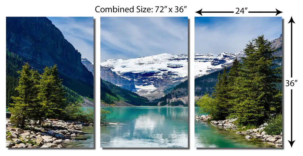 72"œ x 36"œ total size. Ready To Hang! (3 pieces - 24"œ x 36"œ each). 3 Panel Split (Triptych) Metal Print featuring scenic Lake Louise in Alberta Canada, the Canadian Rockies and Victoria glacier. Modern metal wall art for home or office wall decor & interior design. Printed on Luxurious, HD aluminum glossy metal panels. M. HD aluminum panels. Metal print wall art. Includes Shadow Wall Mount on the back.• Aluminum Metal Wall Art• Made in USA• Ready to hang - No assembly required• Shadow mount hardware on the back• 0.045"œ thick HD Aluminum Panels• Scratch resistant, glossy finish• Superb color clarity, luxurious prints• Epson printing process• For indoor or moisture rich environment use• Easy to clean. Gently wipe with microfiber cloth.
