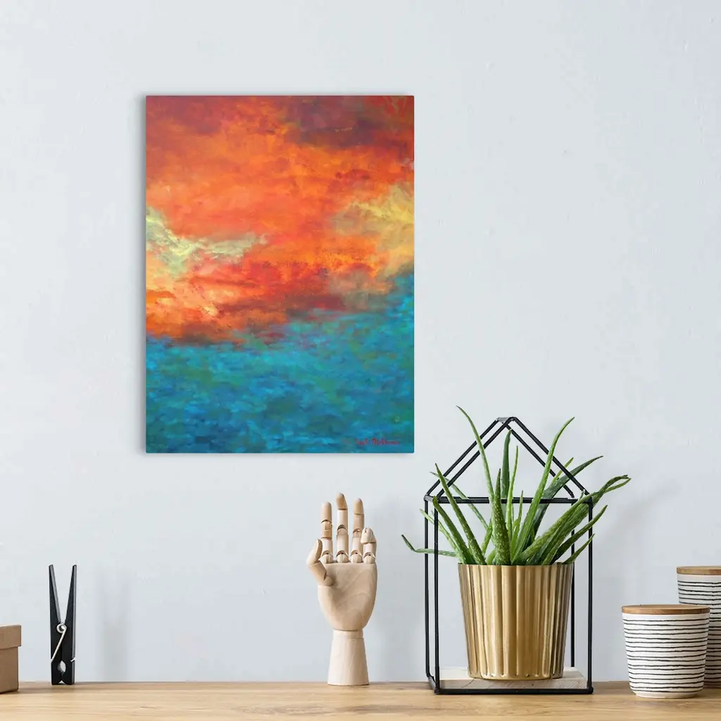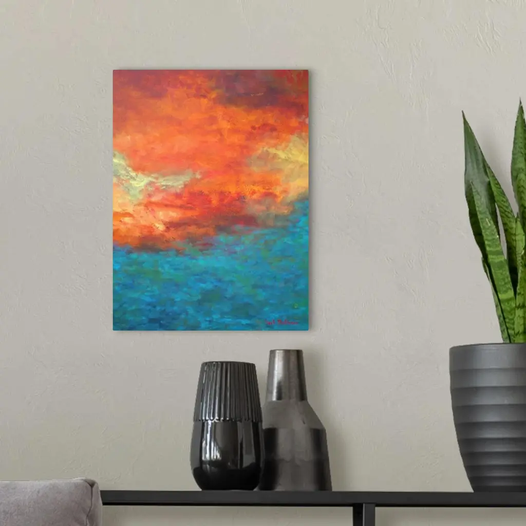 Abstract painting created with bright orange, red, blue, green, and yellow hues representing a reflection on the lake.