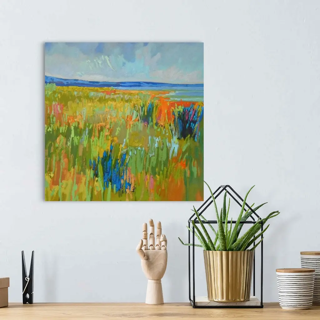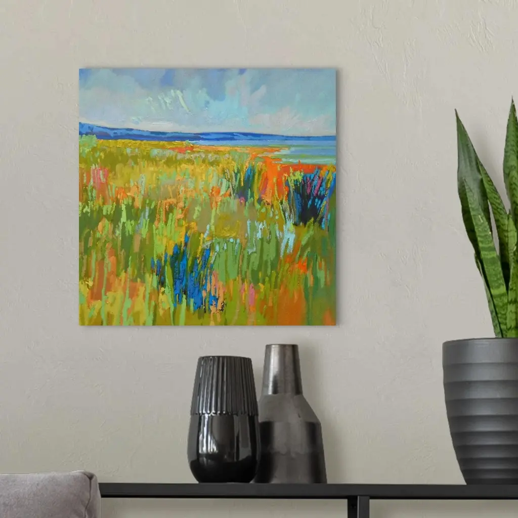 A contemporary abstract painting using vibrant colors resembling a countryside landscape.
