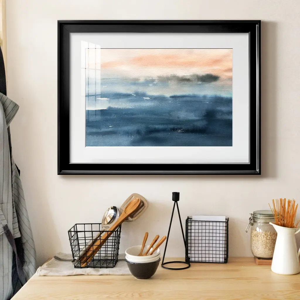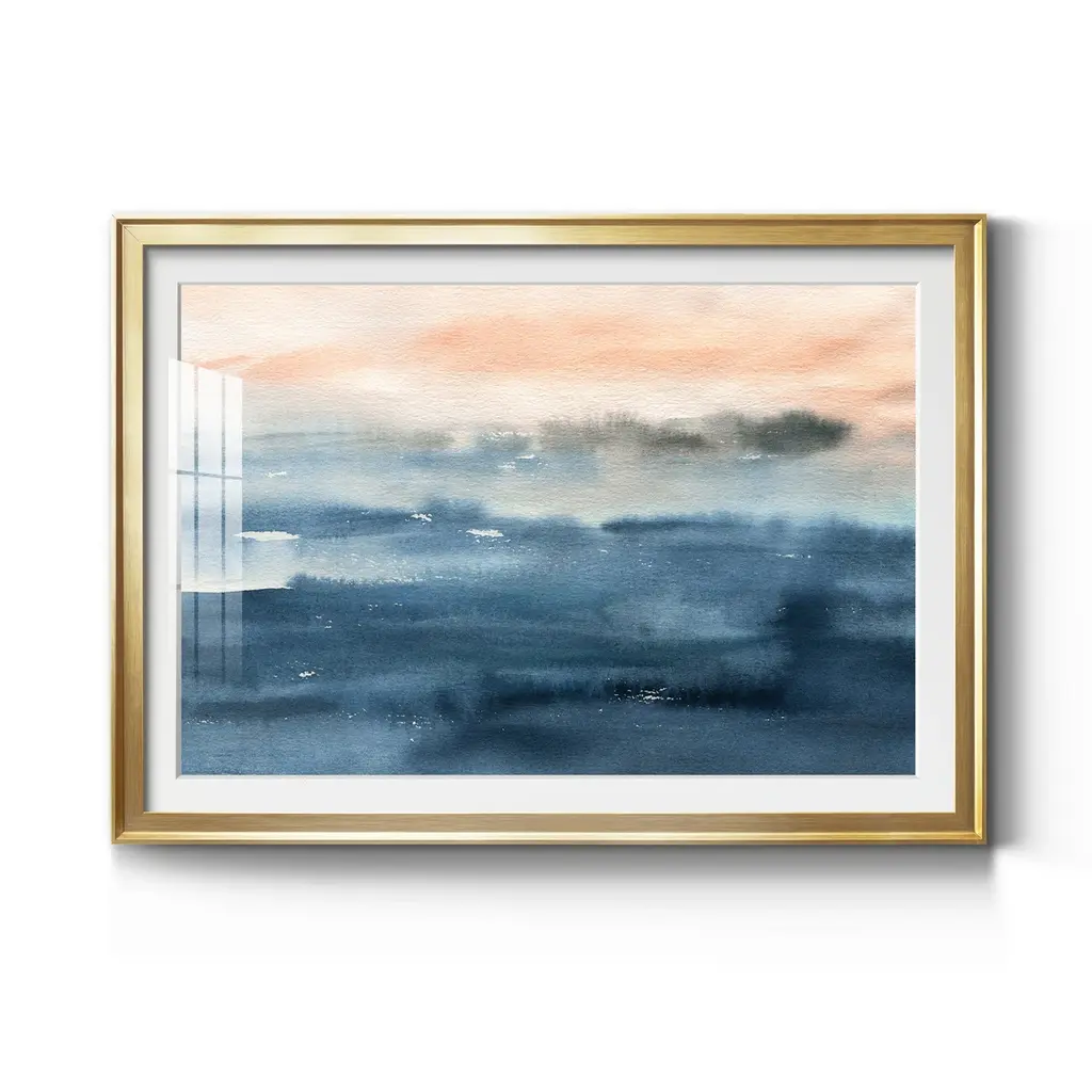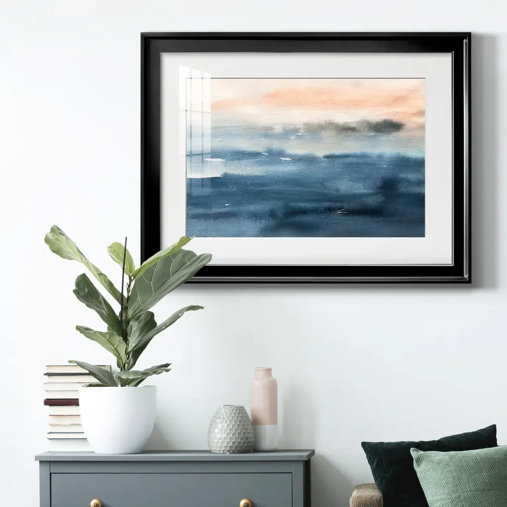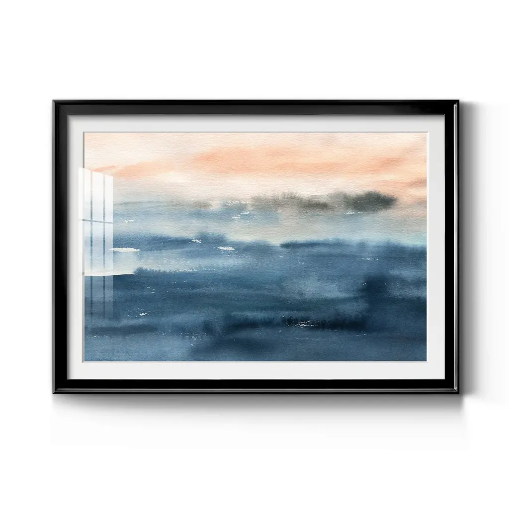 Lake Sunrise Premium Framed Print - Ready to Hang A Premium Framed Print created to last. Framed in distressed wood and available in an array of sizes and colors Featuring a beveled a solid wood stretcher bar, each piece comes ready to hand 4 SIZES AVAILABLE 30.5''X42.5'' - Overall Size 26.5'X36.5'' - Overall Size 22''x30'' - Overall Size 18''x24'' - Overall Size Each piece is made to order. Each piece comes with hanging hardware. Made in the USA Ready to Hang Giclee Paper Print Acrylic Glass Beveled Matt Board