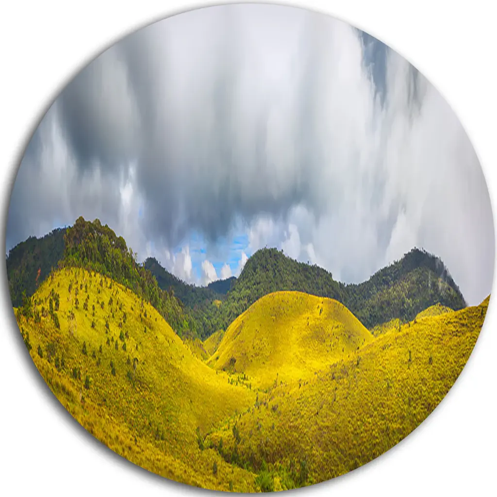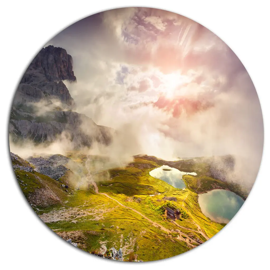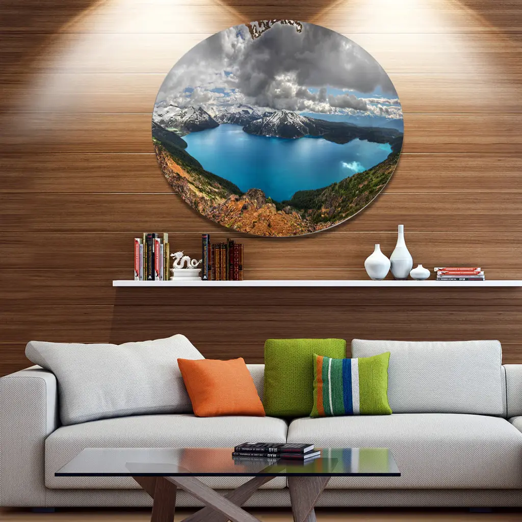 Bring Contemporary Abstraction to your home with this large Circle Metal wall art. This Lake Surrounded by Mountains Metal Artwork makes it the focal point of any room or office. - White Gloss Coating ensures colors are extra vibrant with light reflection.- Aluminum grade Sheet Metal with 1 inch mounting frame on the back giving the illusion that the artwork is floating on the wall..- Mounting Brackets are included along with instructions.- High Quality Digital images are created directly into a glossy aluminum panel producing a stunning and captivating print into the glossy finish of the metal.- Water, Fire and Scratch resistant HD Aluminum panels.- Looks better than any photo paper and guaranteed to last at least 20 years- Easy to clean with a microfiber cloth. Colors are far superior to regular Canvas Art. - Easy to Hang