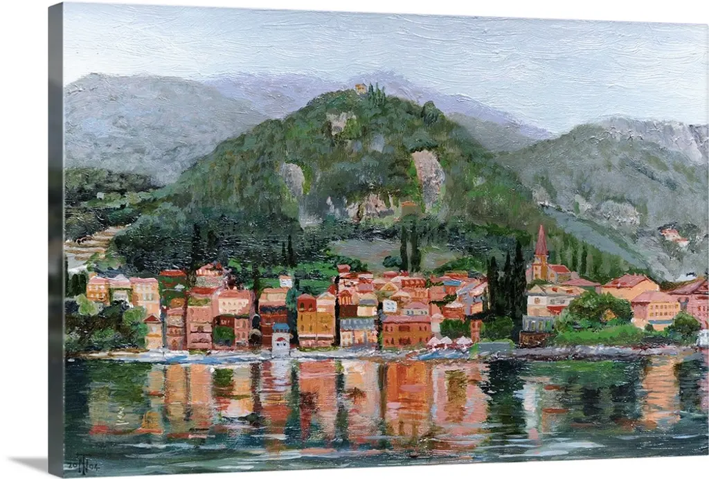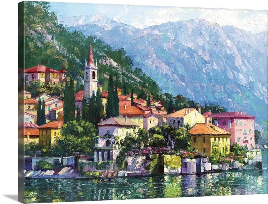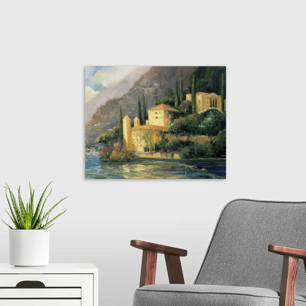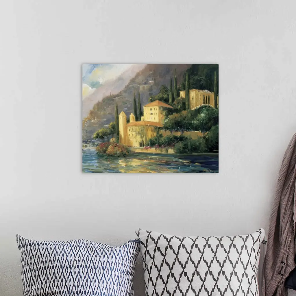 Painting of a villa on the water's edge in Italy.