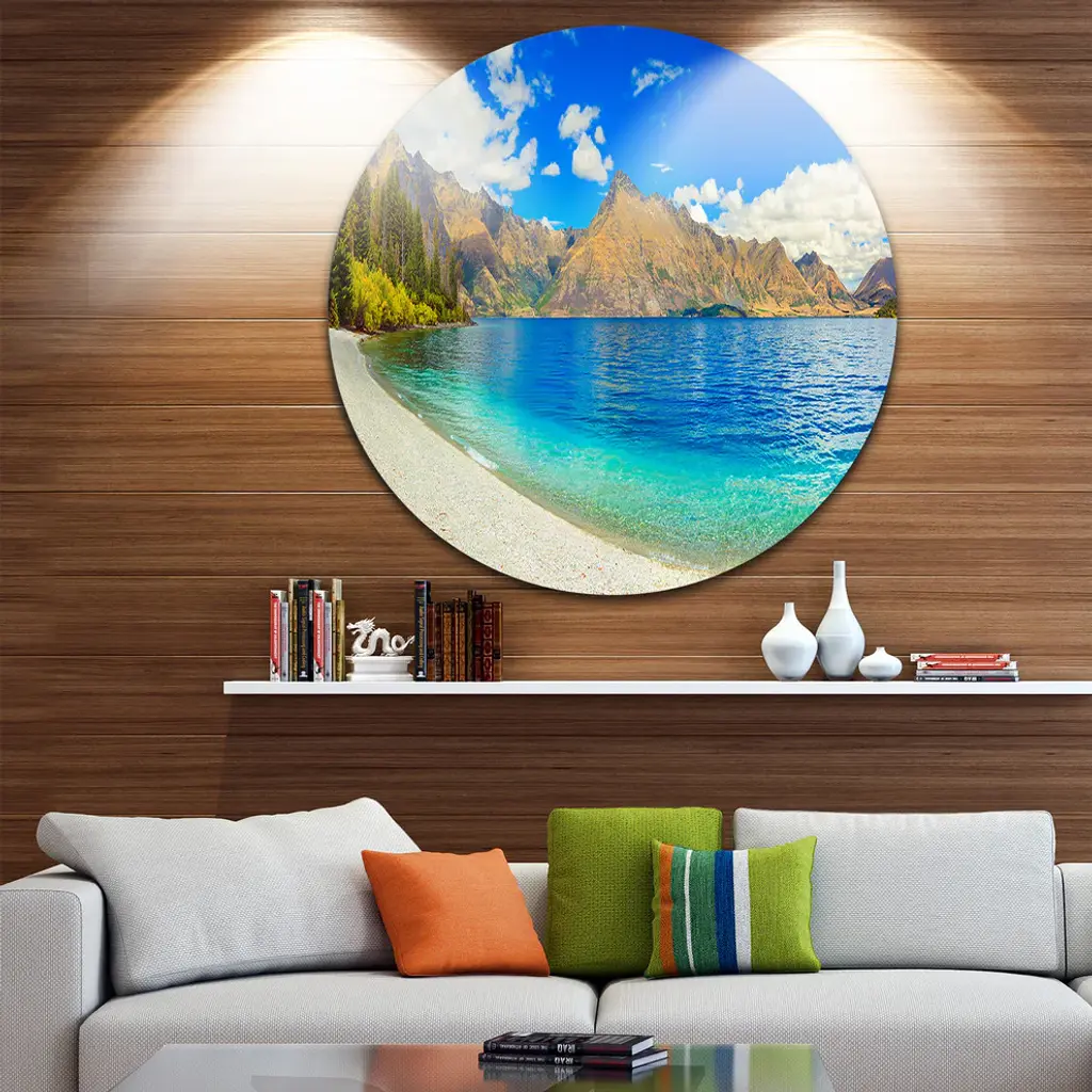Bring Contemporary Abstraction to your home with this large Circle Metal wall art. This Lake Wakatipu Landscape Metal Artwork makes it the focal point of any room or office. - White Gloss Coating ensures colors are extra vibrant with light reflection.- Aluminum grade Sheet Metal with 1 inch mounting frame on the back giving the illusion that the artwork is floating on the wall..- Mounting Brackets are included along with instructions.- High Quality Digital images are created directly into a glossy aluminum panel producing a stunning and captivating print into the glossy finish of the metal.- Water, Fire and Scratch resistant HD Aluminum panels.- Looks better than any photo paper and guaranteed to last at least 20 years- Easy to clean with a microfiber cloth. Colors are far superior to regular Canvas Art. - Easy to Hang