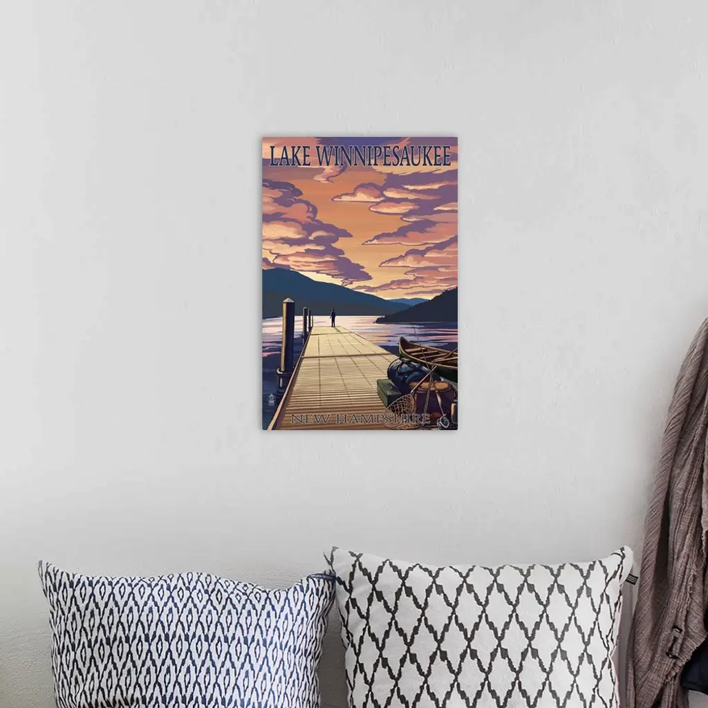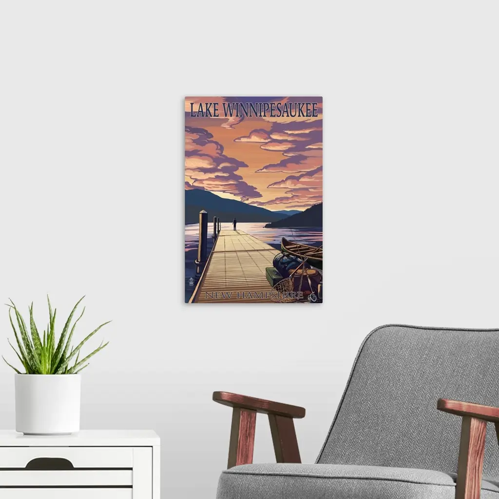 Lake Winnipesaukee, New Hampshire - Dock Scene at Sunset: Retro Travel Poster wall art for home and office decor. Discover canvas art prints, photos, mural, big canvas art and framed wall art in GreatBigCanvas.com's varied collections.