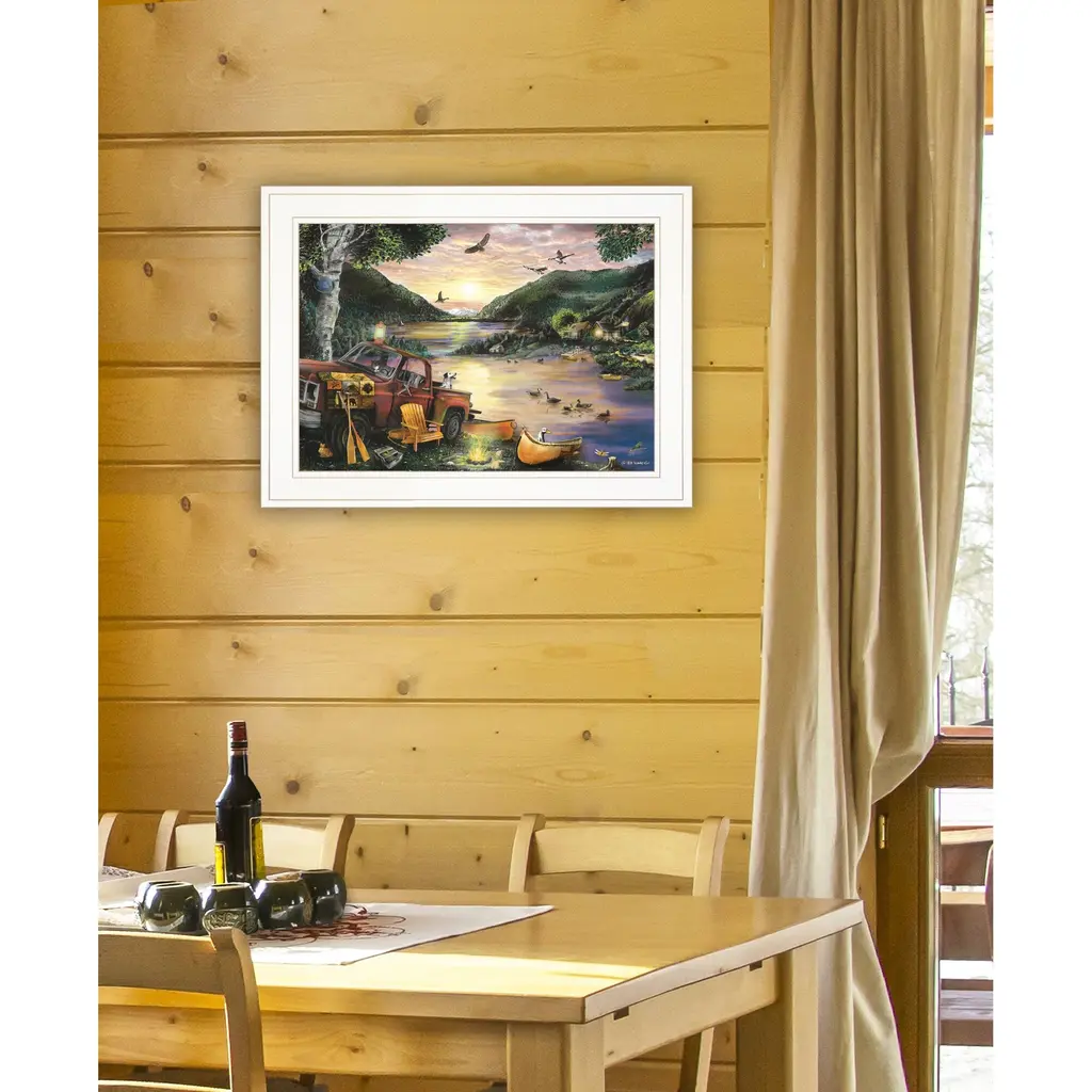 The lakefront camping i 2 white framed print wall art is the perfect decorative accessory for your home. This print is a visual artistic expression that allows you to decorate your space in style. Reproduced for you on paper, this hanging decorative accent will be a trendy and fashionable way to dress your walls. Hang on your wall to add some up to date fashion and decoration. Utilize this opportunity to create a focal point in the room with this fabulous wall decor option. 15" H x 19" W x 1" D