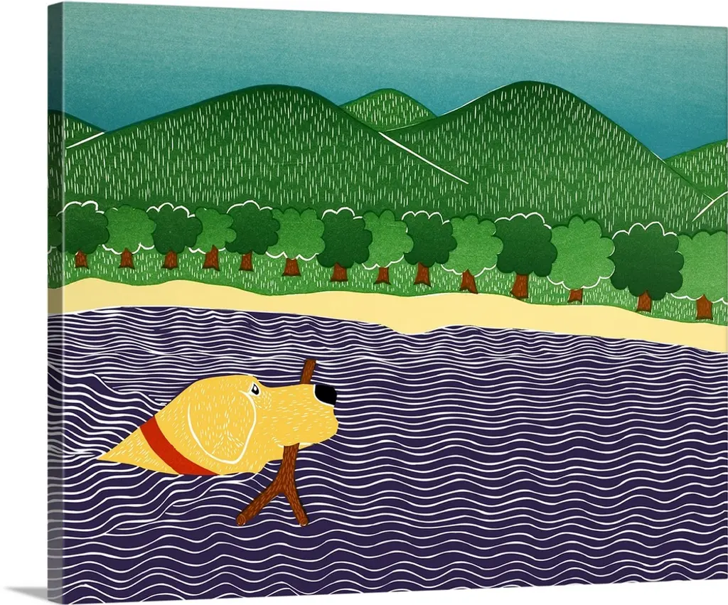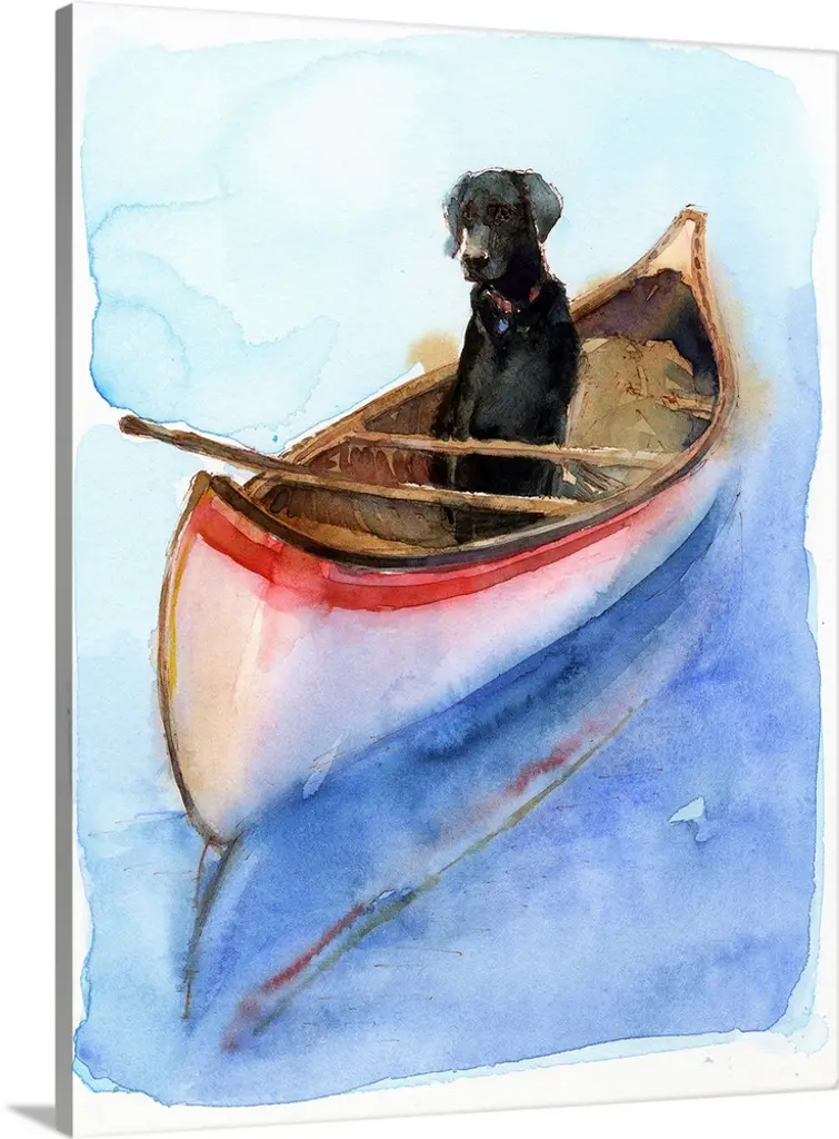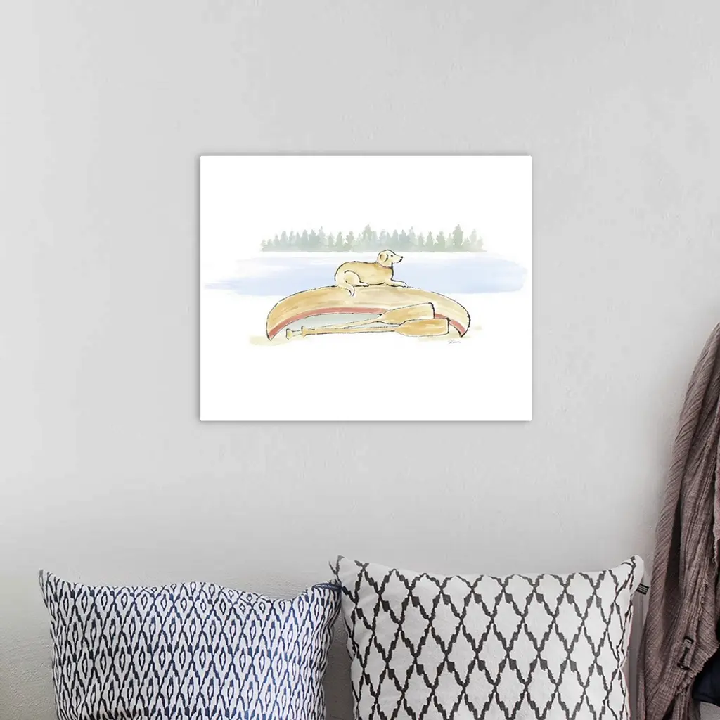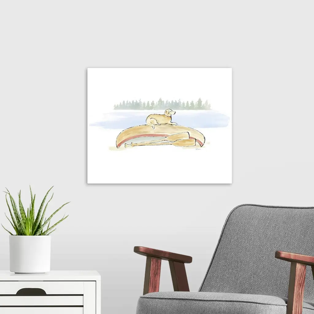Watercolor painting of a yellow lab on top of a canoe next to the lake.